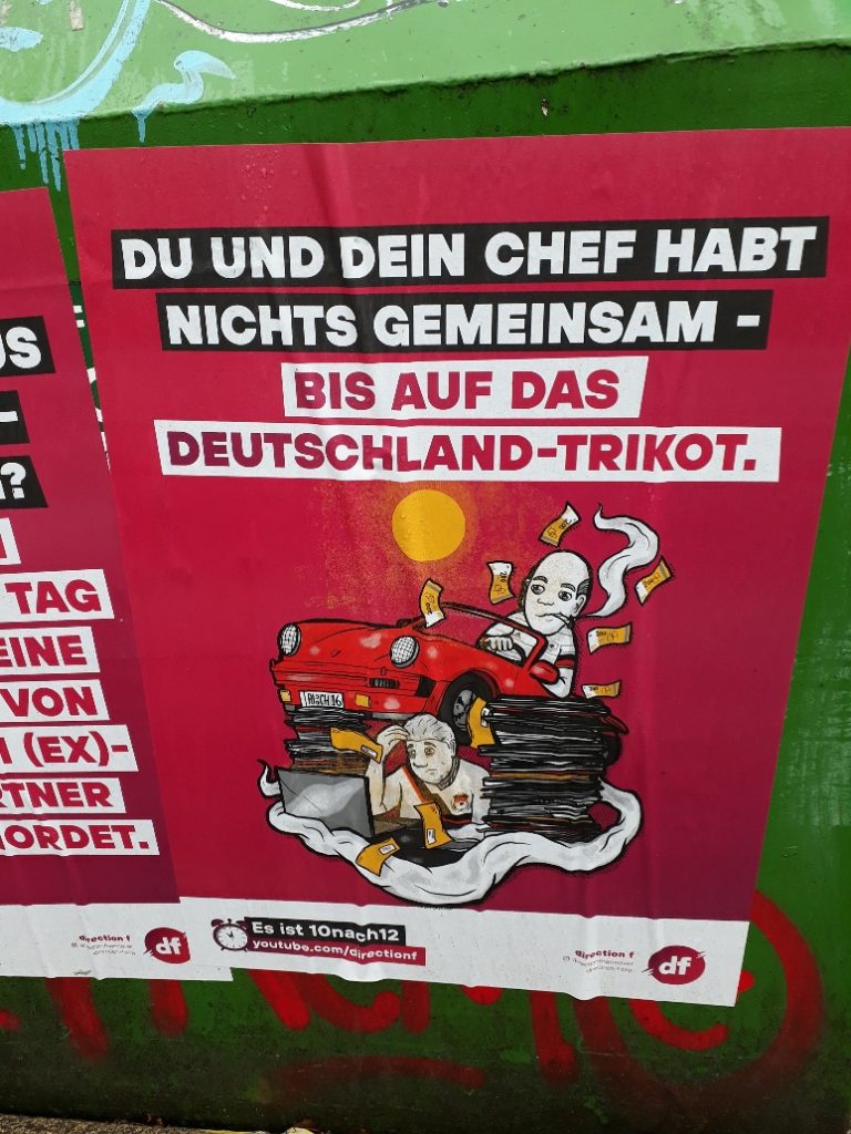 Meine Wette für die Wahl heute in Ba-Wü: SPD unter 10 Prozent. Ich hoffe, ich liege falsch. Nichts wäre falscher als in naiven Agenda 2010-Rachegelüsten schwelgend der SPD den Untergang zu wünschen angesichts der Alternative, die eine für Deutschland ist und damit in den brauen Sumpf führt. Der Claim auf dem Plakat trifft es schon, die ideologische Funktion des Fußballs auf den Punkt gebracht: Panem et circenses, die Vertuschung des Klassenkonfliktes.