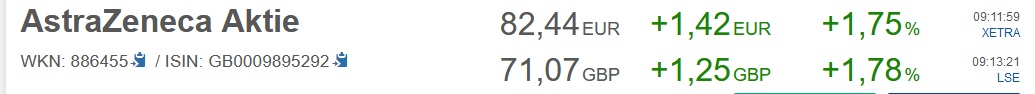AstraZeneca, Stand heute 09:11:59 Uhr. Wenn Sie Zweifel an AstraZeneca haben, folgen Sie dem Markt, der Stoff ist mit einem Plus von 1,75 Prozent in den Markt gestartet und hat übers Seuchen-Jahr fast 20 Prozent zugelegt. Der Markt besteht zwar zu einem gerüttelt Maß an Psychologie, aber bei Bewertung und Kauf von Einzelwerten haben überwiegend Experten und Algorithmen das Sagen, und die richten sich eher nach Fakten und nicht nach Gemunkel in Internetforen und Entscheidungen des großen Obervirologen Jens Spahn. Das mit den Experten haut natürlich nicht immer hin, siehe Wirecard, aber im Großen und Ganzen glauben Sie mir als dem Warren Buffet der Norddeutschen Tiefebene mal: Follow the market.