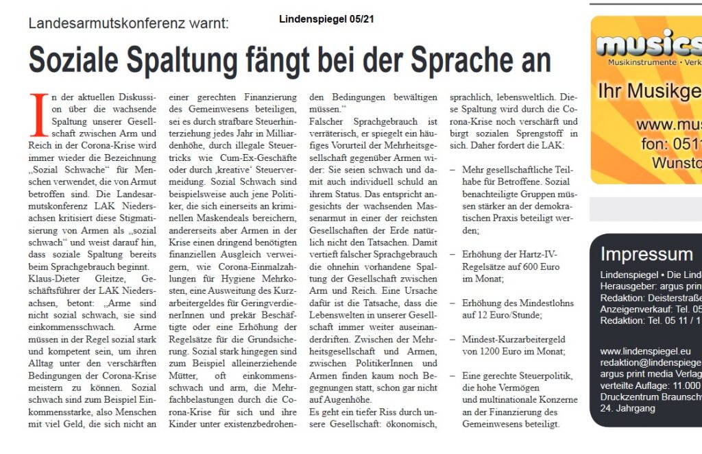 Dass die HAZ mit der deutschen Sprache das veranstaltet, was die Römer einst mit Carthago machten, ist bekannt. Neuer Tiefpunkt ist eine Überschrift am 05.05 „Stadt Hannover und Region planen Impfangebote für sozial schwache Viertel“. Nach meinem Leserbrief-Hinweis an die Redaktion ist das mittlerweile online geändert in „Neue Impfoffensive in sozialen Brennpunkten“, aber die HAZ verwendet diese falsche und diskriminierende Bezeichnung „sozial schwach“ permanent. Ich bin gespannt, ob die HAZ den Leserbrief veröffentlicht, und – viel wichtiger: Ob sie ausnahmsweise mal was begreift.