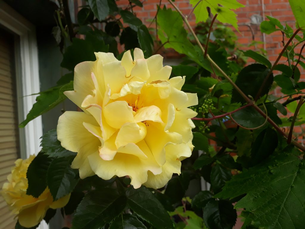Rose auf meiner Veranda, in Nasenhöhe. Es gibt verschiedene Arten, den Tag zu beginnen. Man kann ihn sich durch Arbeit versauen oder für einen Moment ins Reich der Sinne fliehen, z. B. durch den Duft einer frisch erblühten Rose, die vielleicht noch betaut ist vom Verschwinden der Nacht. So lässt sich das morgendliche Katastrophen-Update durch den Deutschlandfunk und der Blick auf die Erledigungsliste des Tages –Zoom Sitzung 12 Uhr vorbereiten (Worum geht es da überhaupt? Und: Noch immer keine Socken gekauft!!) – leichter ertragen. Einfach mal der Ästhetik das Zepter des Alltags überlassen. Mitunter reicht auch ein Anblick.