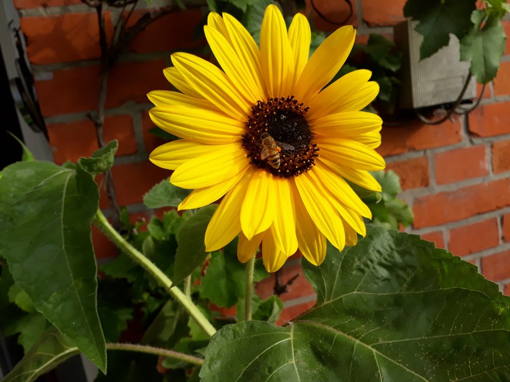 Biene mit Pollenhöschen. Einen Vorteil haben Sonnenblumen auf jeden Fall: bei kleineren Exemplaren kann man Bienen bei ihrer Arbeit beobachten, ohne sich bücken zu müssen. Ich bin immer wieder erstaunt, wie viele Arten es jenseits der Biene Maja-Variante gibt. Noch.