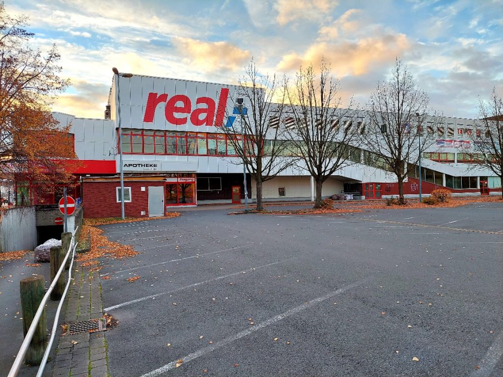 surreal. Bei mir umme Ecke. Geschlossen. Riesige Handelsflächen stehen im Gewerbegebiet hier leer, ganze Bunker aus den prosperierenden 70ern wie der von Real. Dazu kommen noch größere Industriebrachen; Gewerbe und Industrie überlagern sich hier, gut erschlossen durch Schnellwege, sogar einen Hafen hat’s einen Steinwurf weit weg. Manchmal entsteht Neues, wie ein, zwei Gebäude mit dem verblasenen Namen Hannover-Docks. Da kann ich meine Wohnung auf Grund des Teichs in meinem Garten auch gleich beschreiben mit „Wohnen am Wasser“.