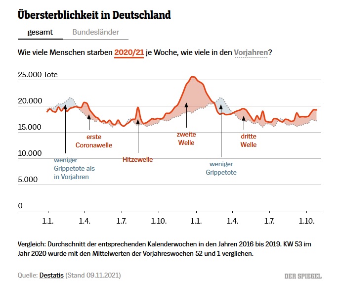 Corona-Übersterblichkeit 2020/21 (in rot) im Vergleich zu Vorjahren (in grau). Zitiert nach Statistischem Bundesamt, das Zitierungen ausdrücklich erlaubt, mit Quellenangabe. Sie können das also in der Form verwenden. Die roten Kurven wären noch mehr als doppelt so steil ab Wirksamkeit Impfungen, gäbe es keine Vakzine. Ungeimpfte stecken sich dreimal so häufig an. Außerdem sind 90 Prozent aller Intensivfälle Ungeimpfte. Gäbe es keine Hygieneregeln, Lockdowns und gesteigertes Risikobewusstsein in breiten Teilen der Bevölkerung, würden wir die Toten in Säcken in Massengräbern verscharren. Soviel zu dem Irrsinnsgeschwafel von Querspinnern und Impfverweigernden, die behaupten Corona sei so eine Art Grippe.