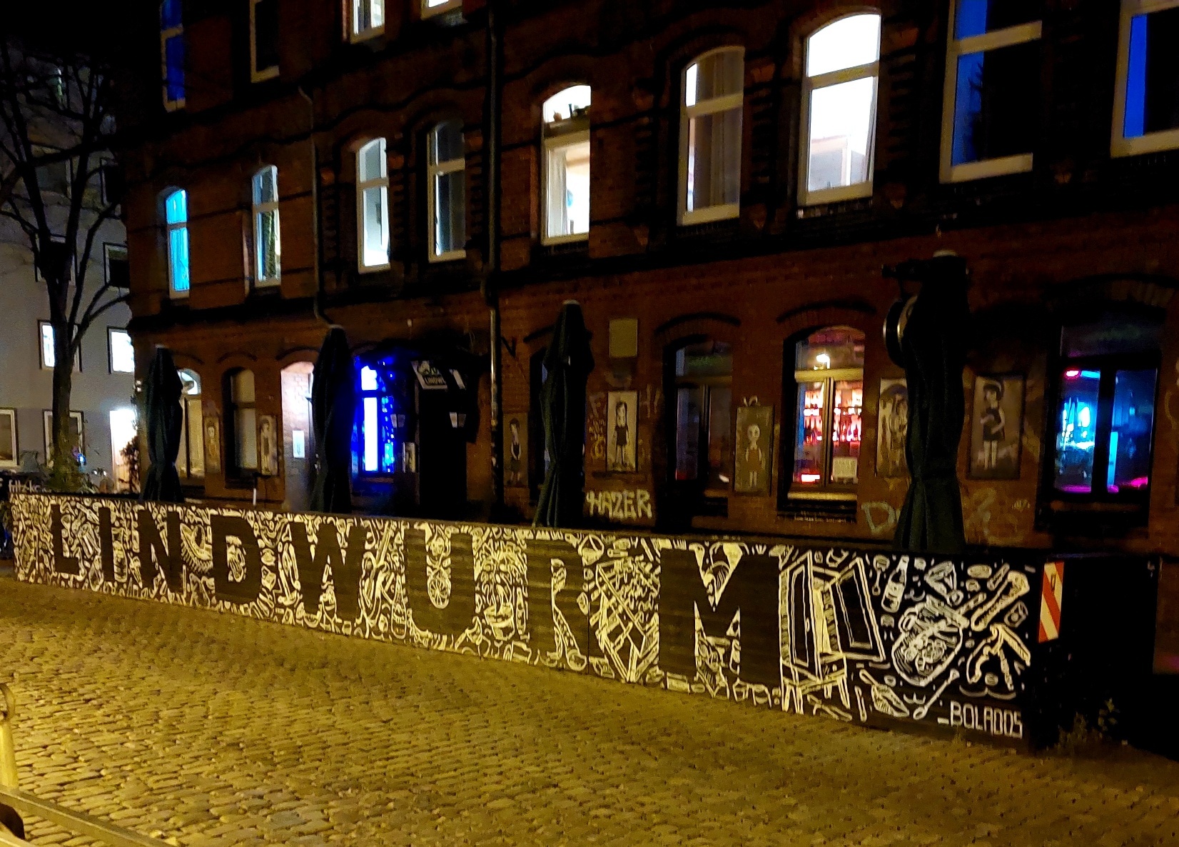 Lindwurm. Kiezkneipe. Mit dem alten Smartphone hätte ich gar nicht erst versucht, was zu knipsen. Lindwurm, also Drachen, fiel mir deshalb ins Auge, weil ich kurz vorher am Kiez-Kulturzentrum Faust vorbeigekommen war.