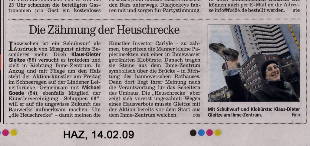 Das Ihmezentrum war für mich offensichtlich ein herausragender genius loci, fanden da laut meinem Presse Archiv doch im Lauf der Jahre mehr als ein Dutzend unterschiedlicher Aktionen, Performances und Interventionen statt. Am anderen Ende von Hölderlin war der „Weltrekord für den kürzesten Karnevalsumzug der Welt“