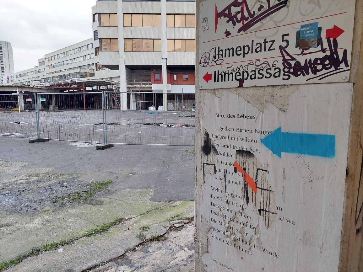 Bröselnder Beton Ihmezentrum, 05.01.22, mit Resten meiner Intervention zum 250. Geburtstag von Friedrich Hölderlin am 20.03.2020. Die taz schrieb darüber: