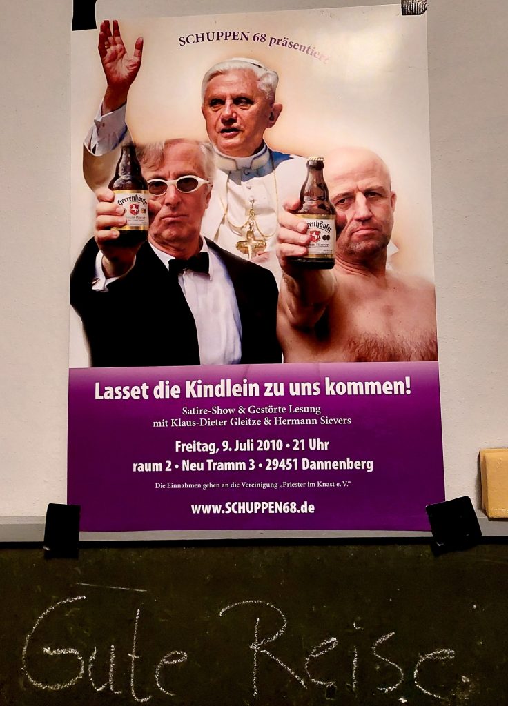 Dieses Plakat von 2010 hängt nicht bei uns im Hausflur, weil ich dem Schutzpatron aller Kinderficker so überragende Bedeutung für meine Existenz beimesse, sondern als Erinnerung an den wohl legendärsten Auftritt des ingeniösen Duos Gleitze & Sievers. An den Abend werden sich die Beteiligten noch auf dem Totenbett, ach, was sage ich, weit danach noch, erinnern. Und die „Gute Reise“ am Mitteilungsbrett wünscht nicht dem Zombie in der Kutte eine baldige Fahrt zur Hölle, sondern hat hausinterne Bewandtnis. Soviel zum Setting.