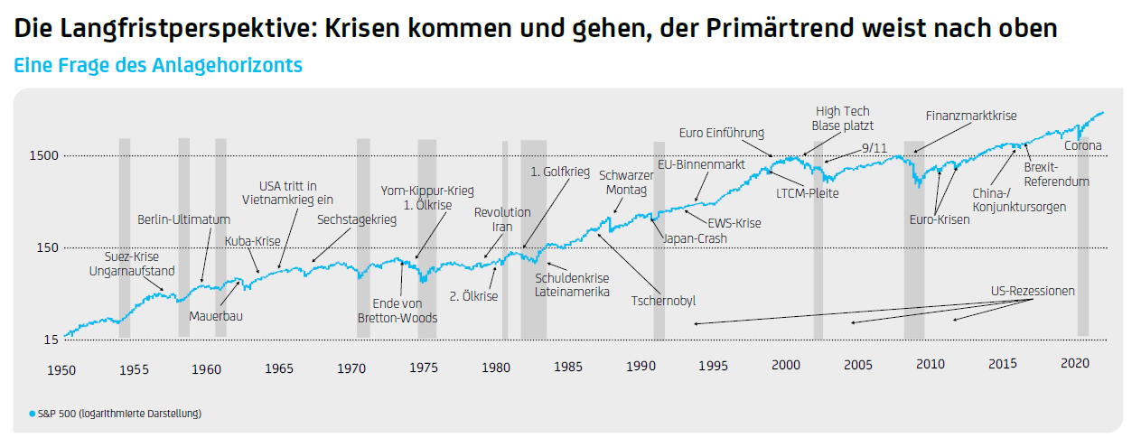 Wertentwicklung des Standard-Poor‘s 500 Index (500 US-Aktienwerte) seit 1950 über alle Krisen. Es ist alles eine Frage des Horizonts.