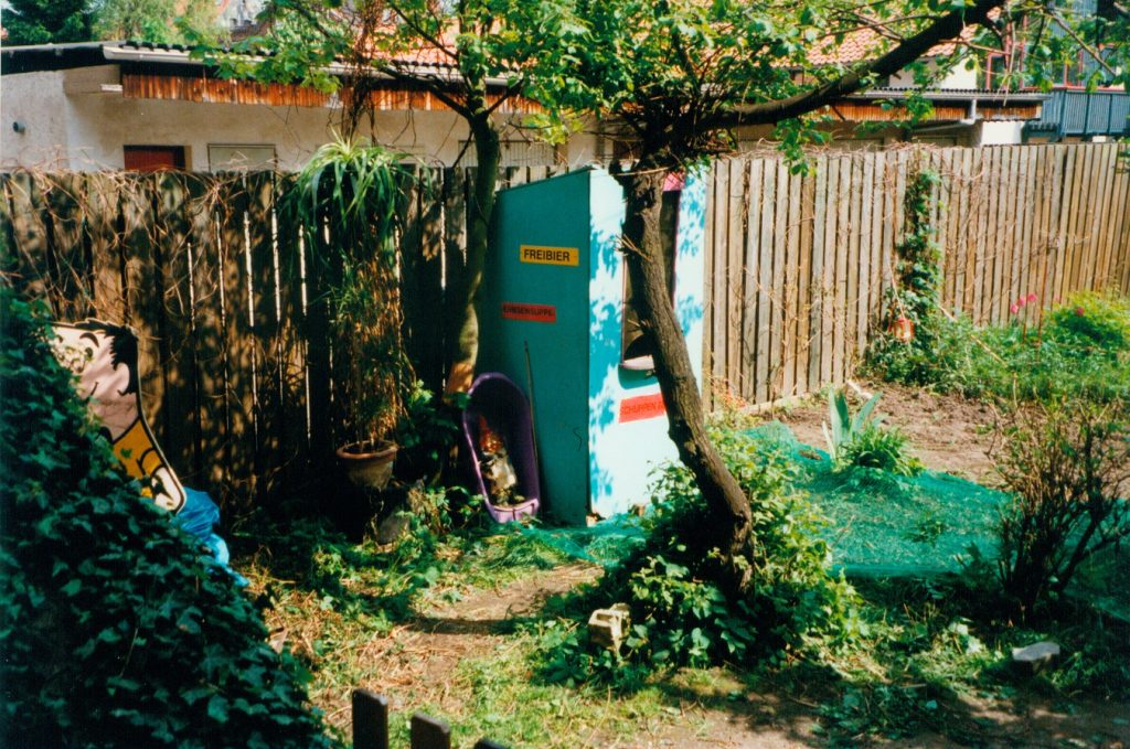 Kassenhaus SCHUPPEN 68. Wurde bei Straßenaktionen immer zum Einsatzort gekarrt. Das mobile Kassenhaus, eine für unsere öffentlichen Interventionen völlig überdimensionierte Skulptur ohne jede Funktion, ragte in ihrer anarchischen Sinnlosigkeit schräg in die von Hektik und Hässlichkeit geprägte Stadtöffentlichkeit.