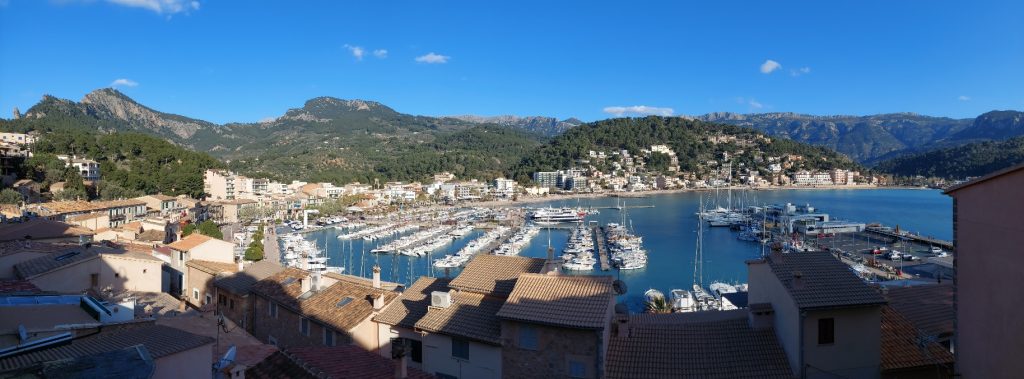 Panoramafoto. Bucht von Porto Soller. Ein Panoramafoto weitet den Blick, wirkt aber oft auch verzerrt. Ich halte den Panoramablick für eine Möglichkeit zur Schulung der Wahrnehmung. Ästhetische Prinzipien lassen sich durchaus in den Alltag transferieren, oft sind sie grundsätzlicher Natur. Bei künstlerischer Gestaltung oder Wahrnehmung lassen wir uns unbewusst von Naturgesetzähnlichen Regeln leiten, wie dem Goldenen Schnitt.