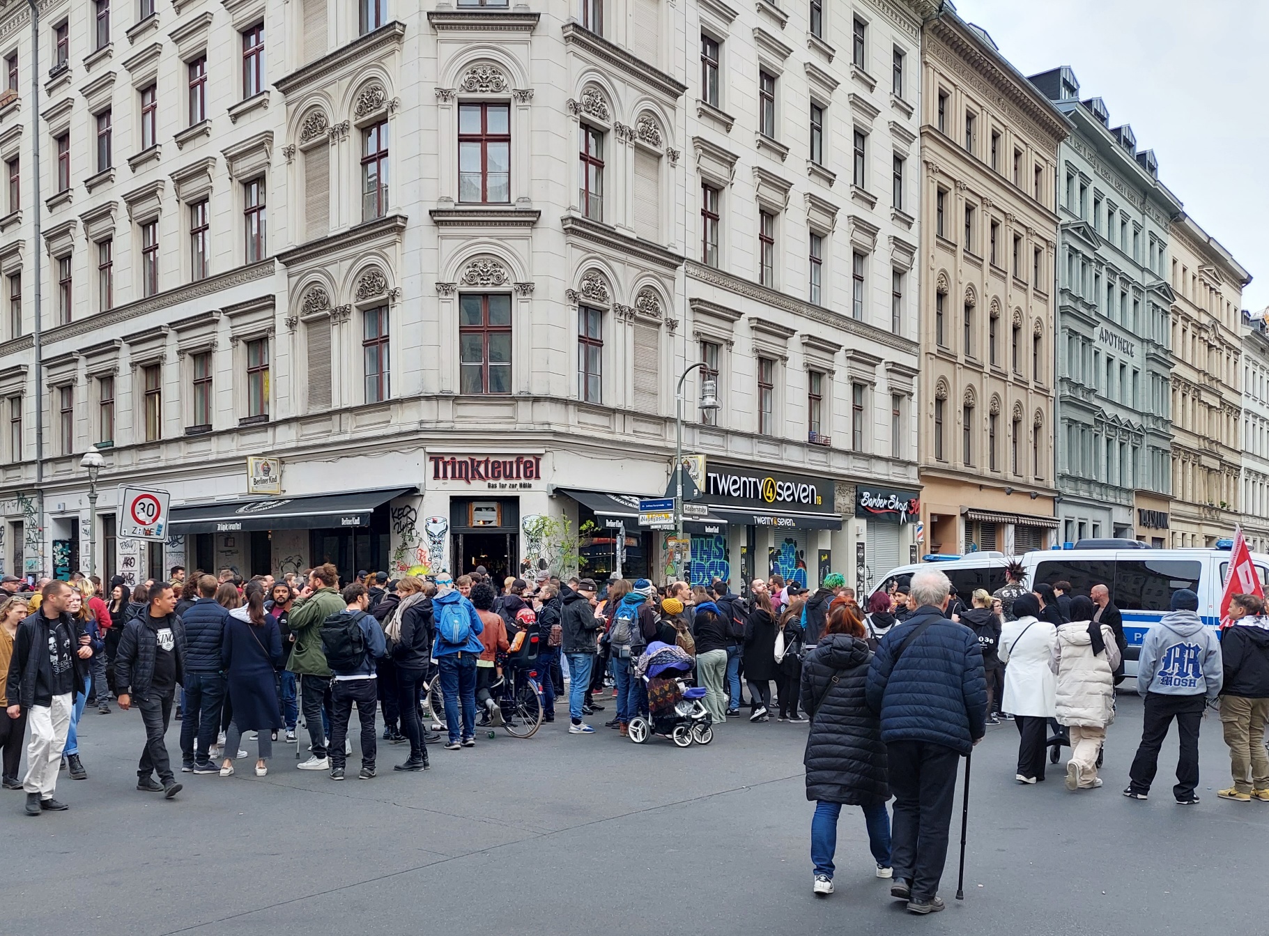 Eher autobefreite Partyzone vom „Trinkteufel“ bis zum „Jodelkeller“. Wie Karneval der Kulturen. Nur ohne Karneval und ohne Kultur. Ermattet mache ich mich auf den Heimweg, von SO 36 nach SW 61. Hubschrauber Geknatter begleitet mich…