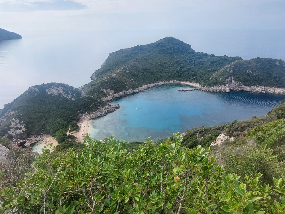 Bucht auf Korfu. Als ich von der Felsspitze des Hügels herunterschaute, dachte ich: Sieht aus wie ein Südsee-Atoll. Im Herunterkraxeln ging mir daraufhin ein Schlager aus den Sechzigern nicht mehr aus dem Ohr: Der Apoll vom Bikini Atoll.
