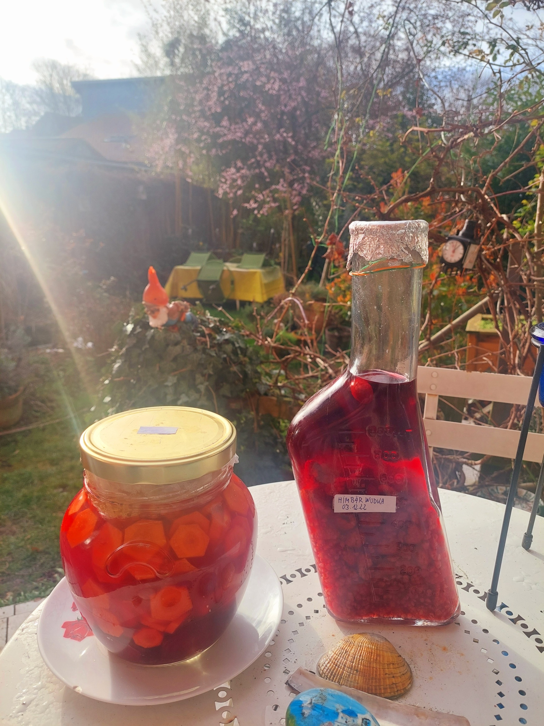 Und lassen Sie den Himbär-Ansatz mindestens vier Monate ziehen, dann ist jede Alkohol-Spritigkeit verflogen und nur noch das köstliche fruchtig-säuerliche Fruchtaroma da.