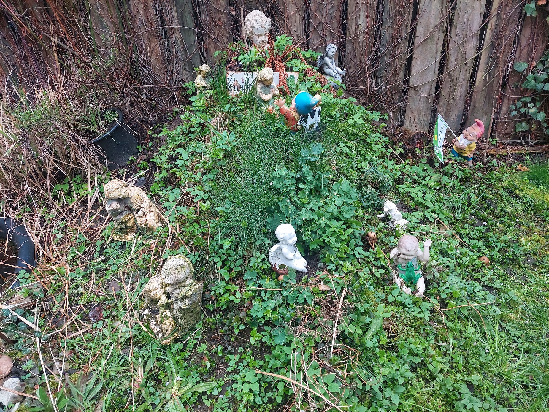 Es ist aber nur der Aushub von meinem Teich und die Figuren sind dem Ritual der Ausmistung zum Opfer gefallen. Wegschmeißen wollte ich aber nicht, jede hat eine Geschichte. Und einen Garten kann man im 21. Jahrhundert unmöglich in einem (Pseudo-)Naturzustand belassen, das muss ironisch kommentiert, gebrochen werden, alles andere wäre Romantik oder Kitsch, also gruselig. So kommt eins zum andern. Wir sind eben im Prozess der Zivilisation unwiederbringlich von der Natur, der Ur-Horde, dem mythologischen Totem entfremdet. Ob das ein Fortschritt ist, muss jede selbst beantworten.