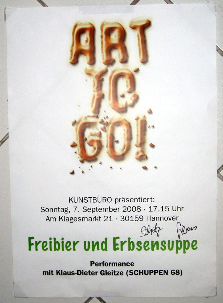 Plakat Performance 07.09.2008, Atelier Kunstbüro. Freibier und Erbsensuppe auf dem Marsch durch die Kulturinstitutionen. Daraus entwickelte sich die Zusammenarbeit mit dem Freund und Kollegen Hermann Sievers, Kunstbüro-Mitglied.