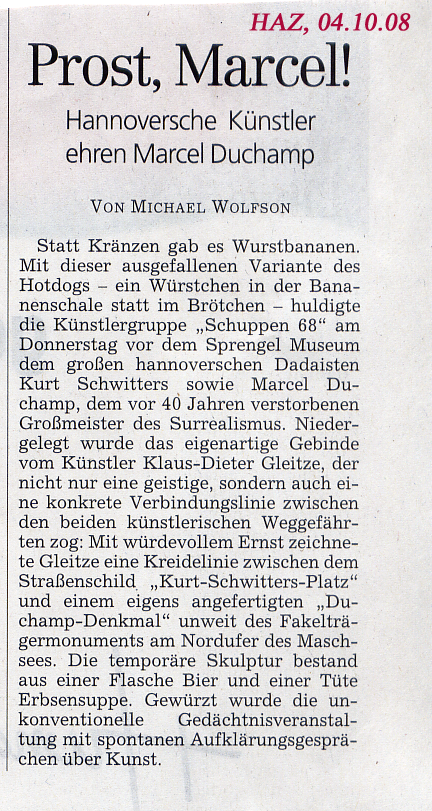 Hommage an Marcel Duchamps. HAZ, 04.10.2008. Wurstbanane. 10 Jahre später wurde eine mit Gaffa an die Wand geklebte Banane für 120.000 Dollar verkauft ….