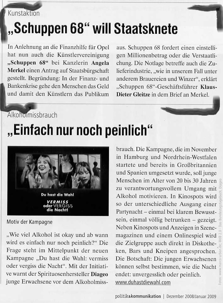 Politik & Kommunikation, Dezember 2008. Das Blatt aus Berlin für politische Entscheider*innen wurde natürlich auch auf den SCHUPPEN 68 aufmerksam. Das mit der Verstaatlichung während der Finanzkrise 2008 hat leider nicht geklappt.