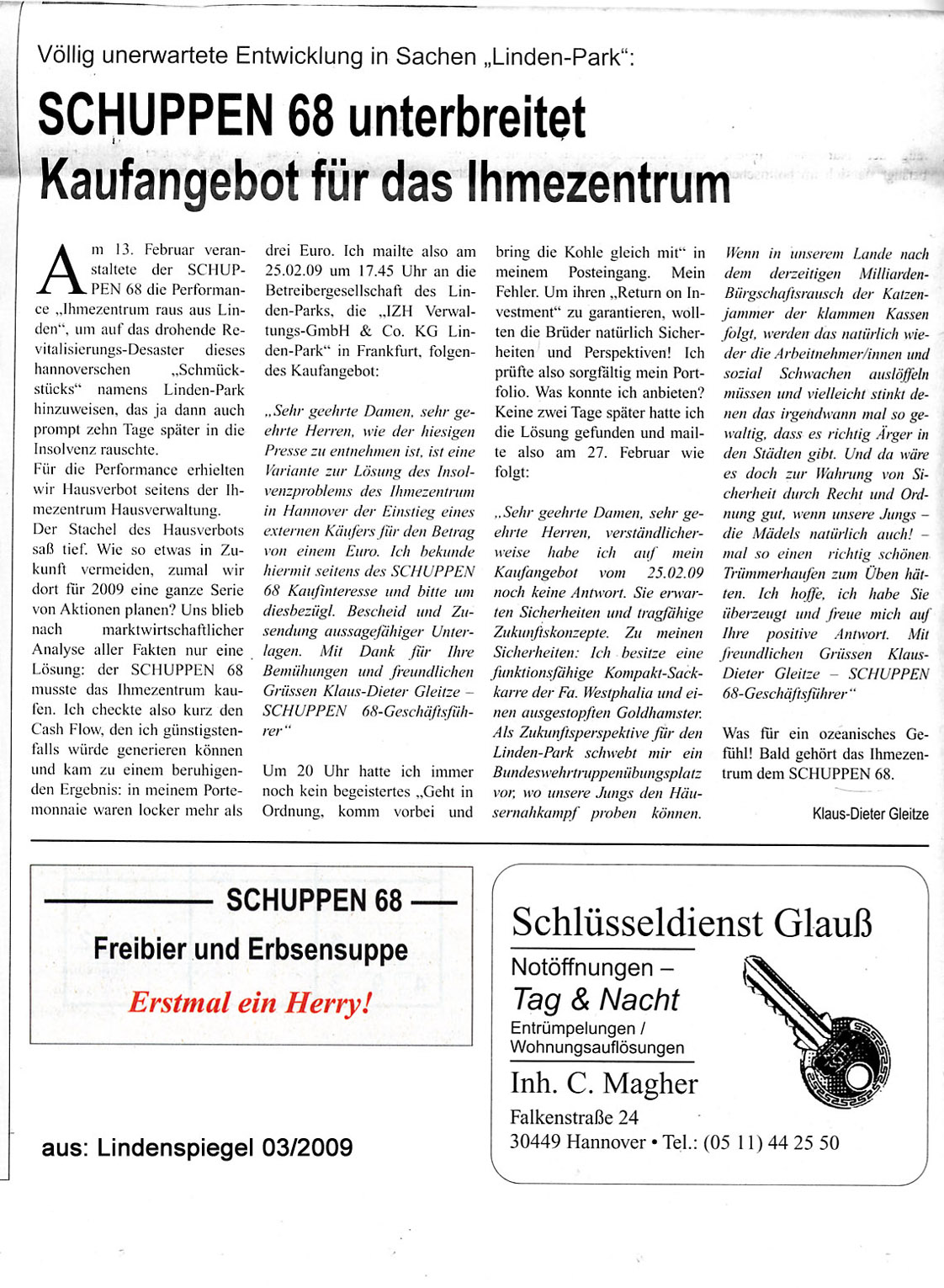 Lindenspiegel, 03/2009. Irgendwann wollte ich den Klotz selber kaufen und für die zu erwartenden innerstädtischen Unruhen bei uns einen Bundeswehr-Truppenübungsplatz draus machen. Das brachte mir einen Shitstorm seitens der Bewohner*innen ein. Was ich verstehen kann. Interessanterweise gibt es da praktisch keinen Leerstand und abgesehen vom baulichen Zustand und der ungewissen Perspektive fühlen sich die Bewohner*innen dort durchaus wohl. Man sollte sich also vor einem arroganten Blick auf die Situation hüten, ähnliches gilt für soziale Brennpunkte. Was die Menschen da oft mit am meisten nervt, sind die respektlosen und kenntnisarmen Zuschreibungen von außen.