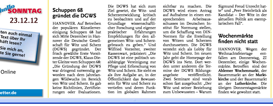 Blick ins Archiv, Hallo Sonntag, 23.12.2012: „Auf Betreiben der populären Künstlervereinigung SCHUPPEN 68 hat sich Mitte Dezember in Hannover die Deutsche Gesellschaft für Witz und Scherz gegründet.“ Ich warte heute noch darauf, dass mal irgendein Stadtbüttel bei mir mit einem riesigen Präsentkorb vorbeikommt und sich dafür bedankt, dass es maßgeblich mein Wirken war, welches Hannover vom Odium der grauen Maus befreit und diesen trostlosen Trübsinnsfleck in der norddeutschen Tiefebene zu einem Zentrum des Frohsinns gemacht hat.