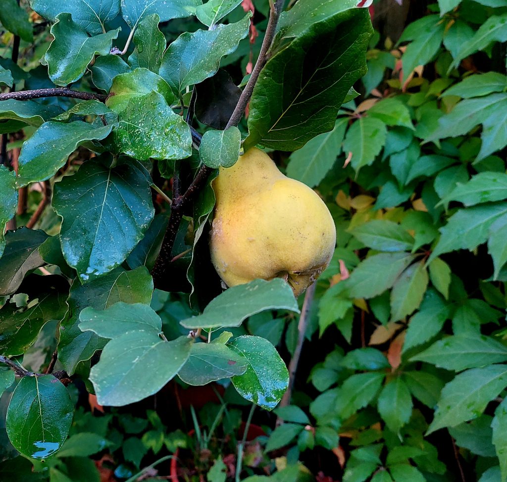 Dicke Quitten. Auch die Quitten sind jetzt reif. Seit einem ikonischen Quittenbrand bin ich von der Quitte fasziniert. Dieser legendäre Quittenbrand, in einem unscheinbaren Wirtshaus vor vielen Jahren, ist für mich der Gral aller Obstbrände. Aber wie das mit der Suche nach dem heiligen Gral so ist: Man irrt jahrelang in der Welt umher, erfolglos, unter Mühen und Qualen. Positiv und Literaturtheoretisch gesehen ist die Gralsgeschichte eine Entwicklungsgeschichte, suchend zur Reife finden. Vom reinen Tor zum reifen Manne. Zum Gralshüter, wobei der Gral Erkenntnis ist. Siehe Parsifal. Im Schlussakt dieser Oper enthüllt Parsifal übrigens den Gral, nun sichtbar für alle, und als göttliches Zeichen der Erlösung schwebt eine weiße Taube hernieder. Ein schönes Bild: ich sitze als uralter Zecher in einem Wirtshaus und habe ihn endlich entdeckt, den heiligen Gral der Obstbrände, DEN Quittenbrand. Ich breche in Tränen aus, was Parsifal nicht gemacht hat, er ist ja nun erwachsen, coming of age. Und von der Decke des Wirtshauses schwebt eine weiße Taube hernieder. Dazu erklingen aus unsichtbaren Lautsprechern die schmelzenden Schlussakkorde von Wagners Parsifaloper. Die Taube macht allerdings den Fehler und scheißt mir auf den Kopf, worauf ich ihr den Hals umdrehe. Mein Leben ist schließlich keine Wagneroper.