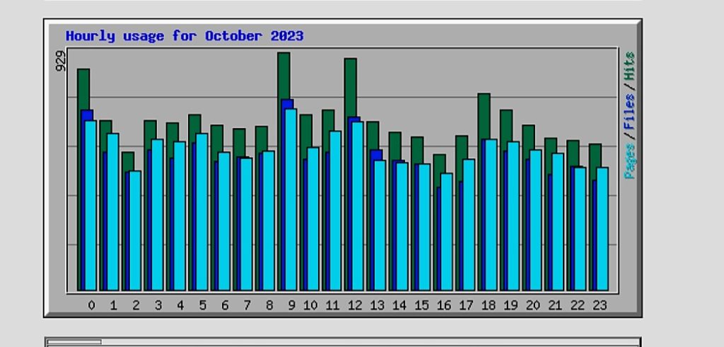 Statistik der durchschnittlichen Besucherinnenfrequenz dieses Blogs im Oktober pro Tag von 0 – 24 Uhr. Interessant an der Statistik: Es gibt kaum nennenswerte Ausreißer, keine großen Tag/Nacht Unterschiede, kaum Absinken zur TV-Prime-Time ab 20 Uhr oder einen extremen Morgengipfel, bei dem die Besucherinnen ihren Tag mit diesem Blog starten würden. Sieht man von 9 Uhr ab, wo die Meisten am Arbeitsplatz angekommen sind und den Arbeitstag vielleicht mit was Lustigem starten wollen.