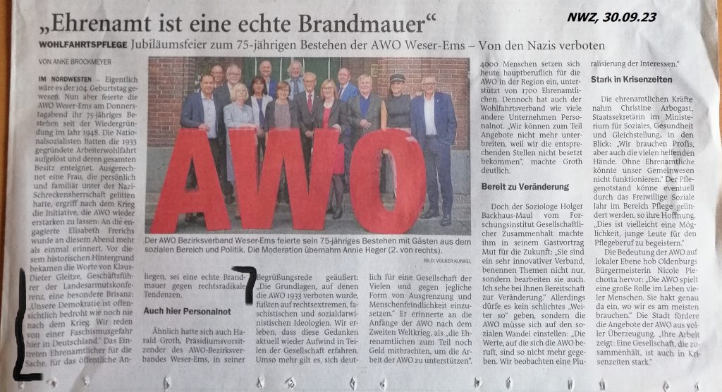 NWZ, 30.09.23. Mittlerweile nutze ich öffentliche Auftritte wie hier als Festredner zum 75jährigen Jubiläum der Wiedergründung der AWO Weser-Ems zur Warnung vor dem Wiedererstarken des Faschismus in Deutschland. Insofern fallen privater Blog und Öffentliches zusammen. Die AWO, die sich übrigens in ihrem Grundsatzprogramm den Idealen des Sozialismus verpflichtet, hat in der Geschichte die Erfahrung gemacht, was Faschismus bedeutet: Sie wurde von den Nazis verboten. Welche Lehren die AWO, und andere Verbände und Organisationen der Zivilgesellschaft, im Ernsteren der Fälle daraus zieht, bleibt abzuwarten.