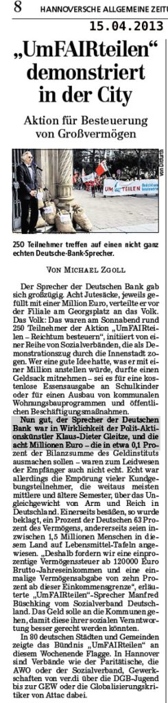 Blick in die Archive, HAZ, 15.02.2013. Der Polit-Aktionskünstler. Medien brauchen Schubladen. Es gibt schlimmere als die des Polit-Aktionskünstler, aber sexy hört sich das nicht an. Nach Agitprop der Weimarer Republik und 68ff, nach Holzhammer und Klaus Staeck. Andererseits ist es in Zeiten wie diesen nichts ehrenrühriges und, bei Lichte betrachtet sogar notwendiges, in der Tradition beispielsweise einer Arbeiter-Illustrierte-Zeitung zu stehen , zu deren Stilmitteln im antifaschistischen Kampf der 20er und 30er Agitprop gehörte. Und an der unter anderem George Grosz, Maxim Gorki, George Bernard Shaw, Käthe Kollwitz, John Heartfield und Kurt Tucholsky mitarbeiteten. Wenn man also bedenkt, auf was für Schultern ich stehe: Potzdonner. Morgen male ich mir ein T-Shirt mit der Aufschrift: Polit-Aktionskünstler.