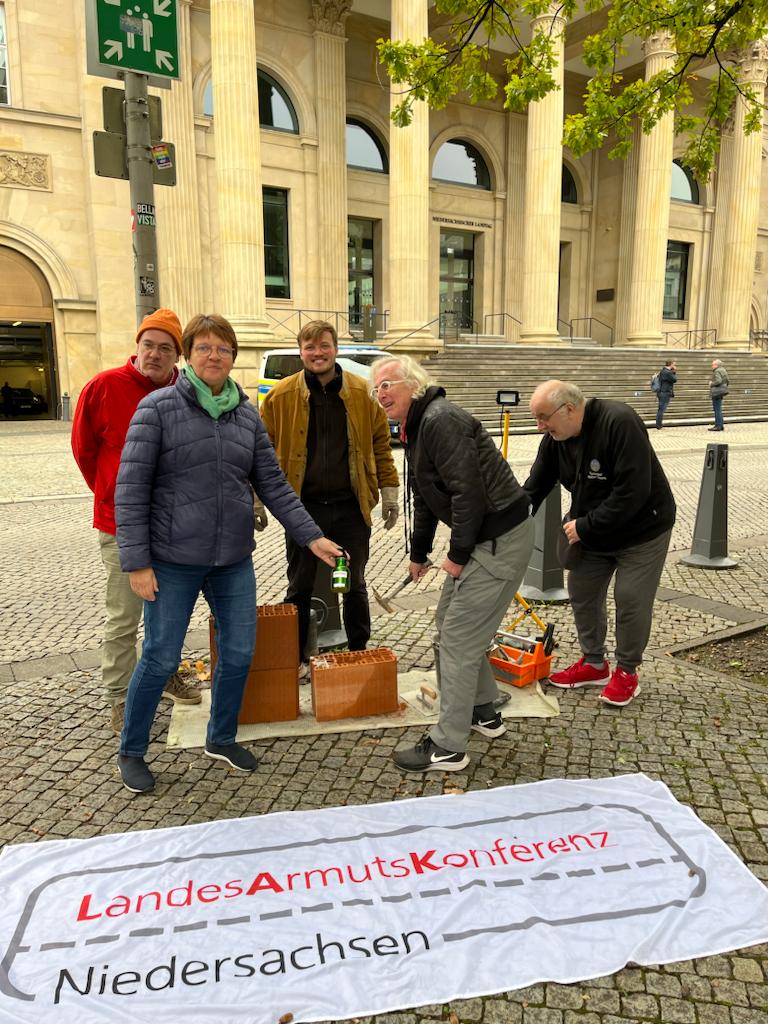 Aktion symbolische Gründung einer Landeswohnungsbaugesellschaft (Scrabble Alarm bei dem Begriff) am Weltarmutstag 17.10 vor dem Landtag. Die Forderungen der Landesarmutskonferenz zu menschenwürdigem und bezahlbarem Wohnen für alle hat Meta Janssen-Kucz, MdL Grüne und Landtagsvizepräsidentin, in Empfang genommen, stilecht in einer Zeitkapsel, wie sie in Grundsteine eingemauert wird. Sie war die Einzige, die adäquat mit den Maurer-Gerätschaften umgehen konnte. Häuslebauerin. Sie hatte sich nachts noch mobilisieren lassen. Sowas kann man dann auch mal dankend anerkennen. Bewegte Bilder dazu gibt’s hier im NDR-TV, bei Hallo Niedersachsen, ab 10.05