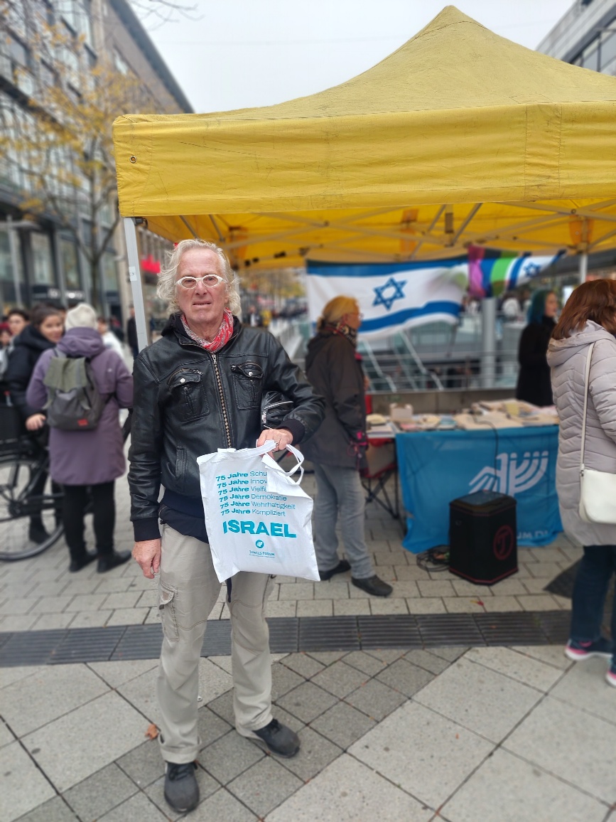 So viele Gestörte wie gestern am Stand habe ich in so kurzer Zeit noch nie erlebt, unfähig zum Diskurs, sofort laut und aggressiv und bar jeder Empathie: „Israel Völkermord blablabla“ „Waren Sie überhaupt schon mal in Auschwitz blablabla“ … Ein durchgeknallter Finsterling, der mich volltextete, er wäre wichtig und wir sollten nach hinten verschwinden, in die hiesige Marktkirche. Hochaggressive junge Männer mit offensichtlichem Migrationshintergrund … Ich war noch nie so froh wie da über das massive Vorhandensein von Polizei, die ohnehin verstärkt im Stadtbild präsent ist angesichts drohender Ausschreitungen des Pro-Palästinamobs. Sie drängte die gewaltbereiten jungen Männer ab. Ich ertappte mich bei vorzivilisatorischen Gewaltphantasien.