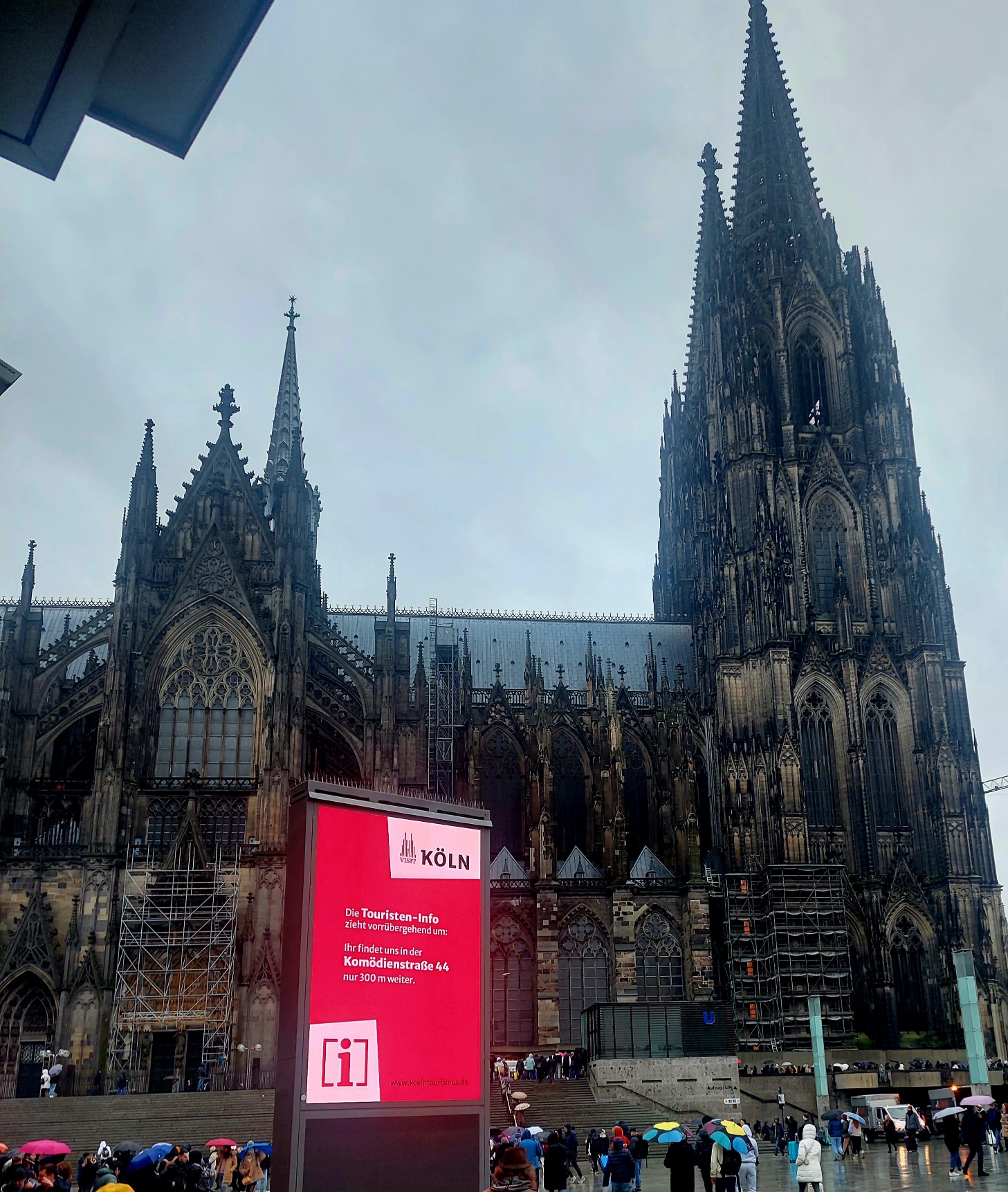 Es zog wie Hechtsuppe auf der Domplatte, saukalt, goss in Strömen und war unglaublich voll. Der Bahnhof ist viel zu groß für die Umgebung, wie eine Wurst da reingepresst, wie eine undichte Wurst, bei der aus allen Löchern die Menschlein quollen wie graues, aasiges Wurstbrät, das ohne Unterlass in den Wurstdarm nachgestopft wird.