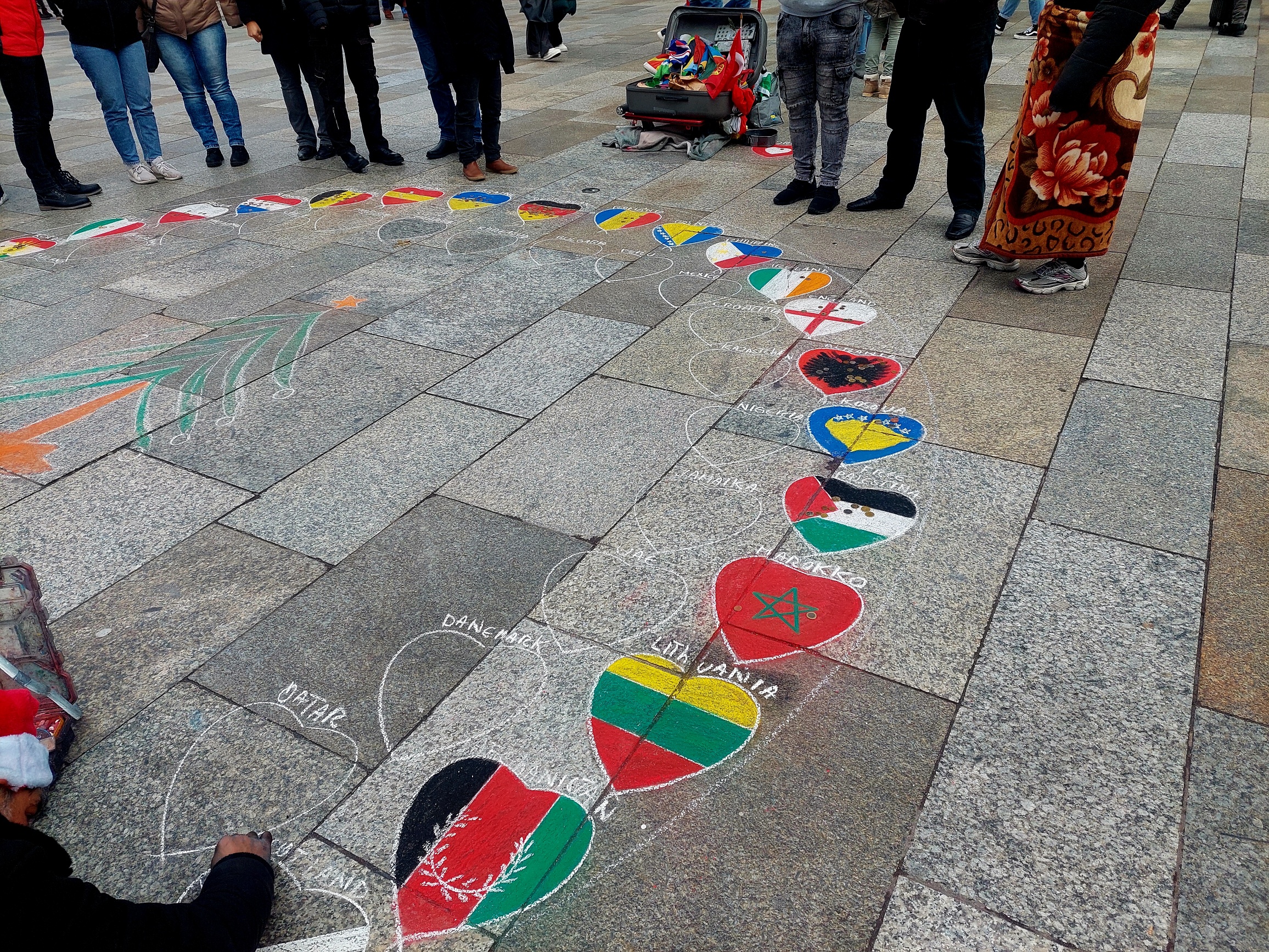 Neben zwei, drei Sätzen in Kreide zum Frieden auf Erden für alle, zeichnete er in niedlichen Herzchen die Farben der Flaggen von zahlreichen Staatengebilden. Zwei fehlten: Russland und Israel. Mag das Fehlen Russlands noch einem kühlen ökonomischen Kalkül geschuldet sein, war das Fehlen von Israel dem Antisemitismus des Schmierfinken geschuldet. Statt Israel prangte da in entsprechenden Farben: Free Palestine. Meint im Regelfall „Von Jerusalem bis zum Meer“ und ist eine knallharte antisemitische Codierung zur Auslöschung des Staates Israel und seiner Bevölkerung. Ich sprach den Mann mehrfach an, auf Deutsch und Englisch: Was ist mit Israel? Erntete aber nur: Nix versteh.
