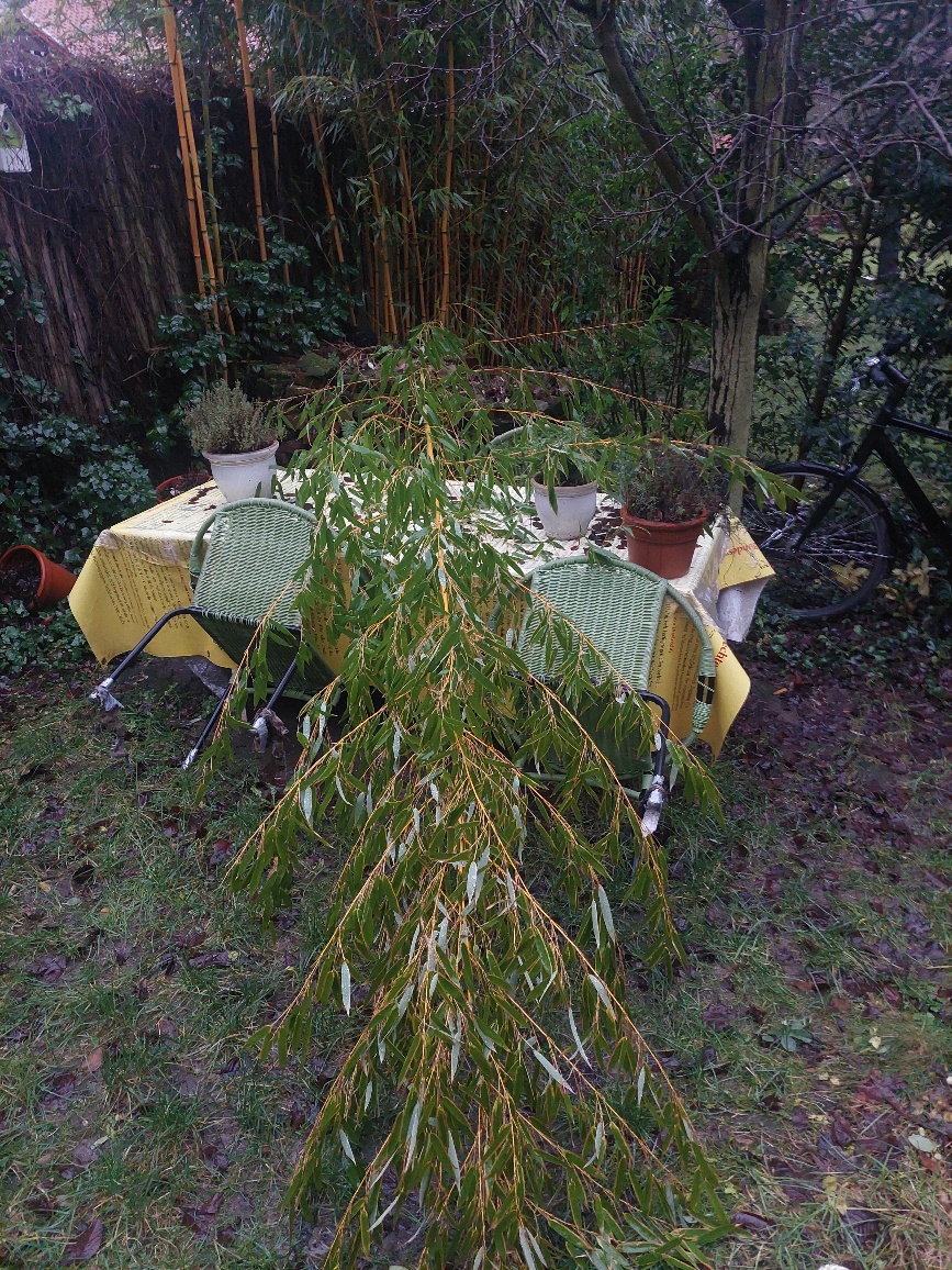 Bambus im Garten, vom Orkan gefällt. Bambus ist eigentlich sprichwörtlich für sein biegsames Spiel im Wind bekannt. Eher fällt es Millionen starrer, unbeugsamer doitscher Weihnachtstannen und Fichten im Sturm als es den geschmeidigen Chinesen-Bambus umhaut. Nun aber doch. Sowas hab ich hier noch nicht erlebt. Ene mene tekel upharsim? Der Boden im Garten kann den Regen gar nicht mehr fassen, ist so vollgesogen und glitschig, dass ich schon zweimal ausgerutscht und auf die Schnauze geflogen bin. Der Teich läuft dauerhaft in einem Rinnsal über, demnächst werden wahrscheinlich die Fische da drin im Regen ersaufen. Ich warte nur darauf, dass der nächste Orkan das Dach abdeckt und Regenfluten das Haus innerhalb kurzer Zeit in den nahegelegenen Fluss spülen. Oder dass mich die nächsten Hitzewellen im fortgeschrittenen Alter dehydrierend an Kreislaufschwäche final die Kuchengabel (ich liebe Süßigkeiten!) weglegen lassen. Von wegen nach mir die Sintflut. Wir sind mittendrin. Eine Hiobsbotschaft jagt die nächste. Die Kerosinpreise z. b. steigen! Mein nächster Flug wird teurer.