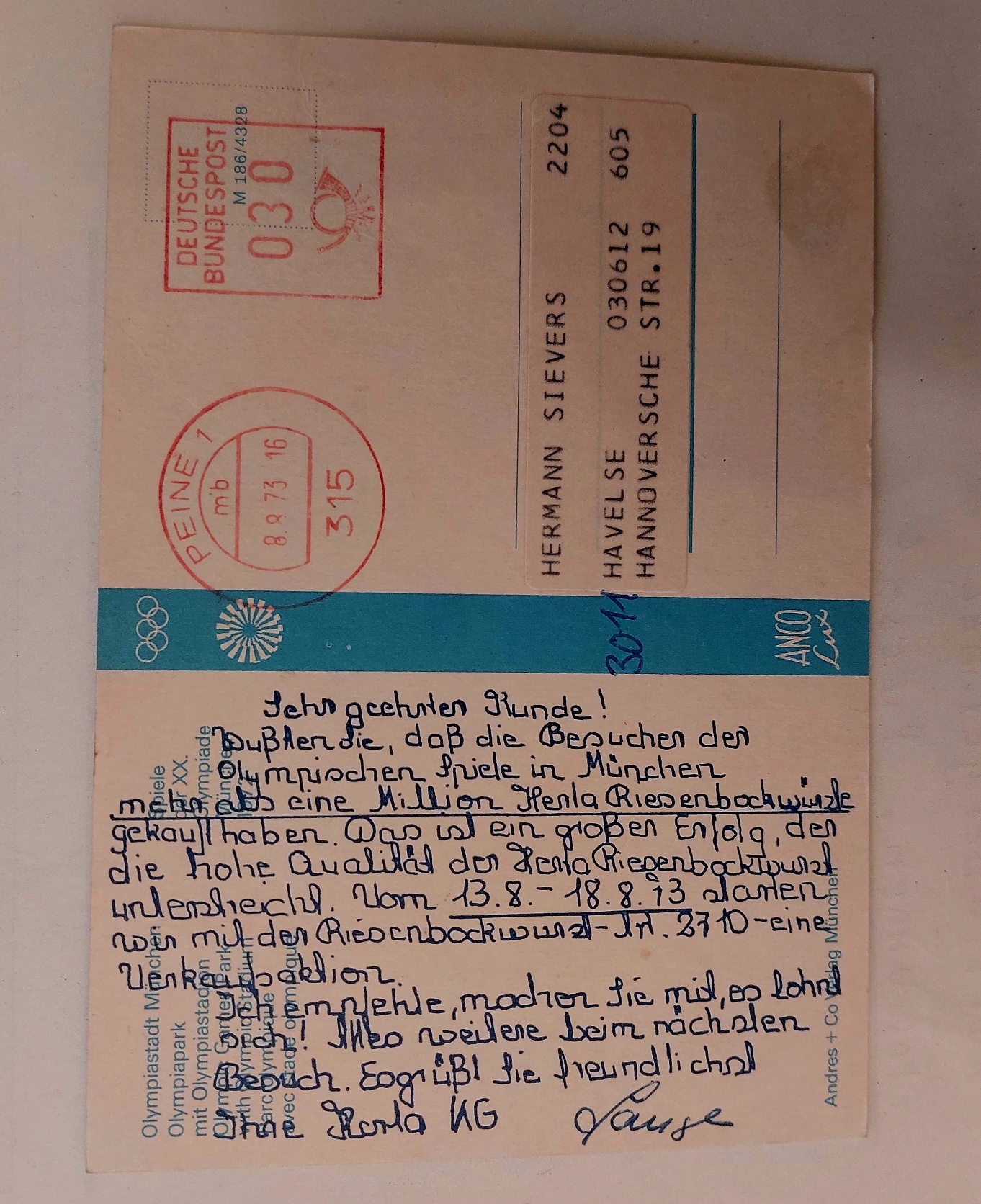„Sehr geehrter Kunde! Wußten Sie, daß die Besucher der Olympischen Spiele in München mehr als eine Million Herta Riesenbockwürste gekauft haben. Das ist ein großer Erfolg, der die Qualität der Herta Riesenbockwurst unterstreicht. Vom 13.8. – 18.8.73 starten wir mit der Riesenbockwurst – Art. 2710 – eine Verkaufsaktion.