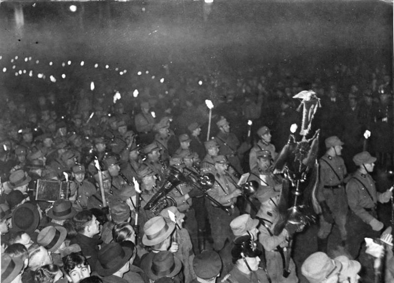 Fackelzug Berlin 1933 anlässlich Hitlers Machtübernahme. Quelle: Bundesarchiv. Es war keine Machtergreifung, die reaktionären politischen Eliten, mit Unterstützung des Kapitals, haben Hitler die Kanzlerschaft aus egoistischen Motiven angetragen. Die geistigen Tiefflieger dachten, sie könnten den Mann bändigen, als ihre Marionette.