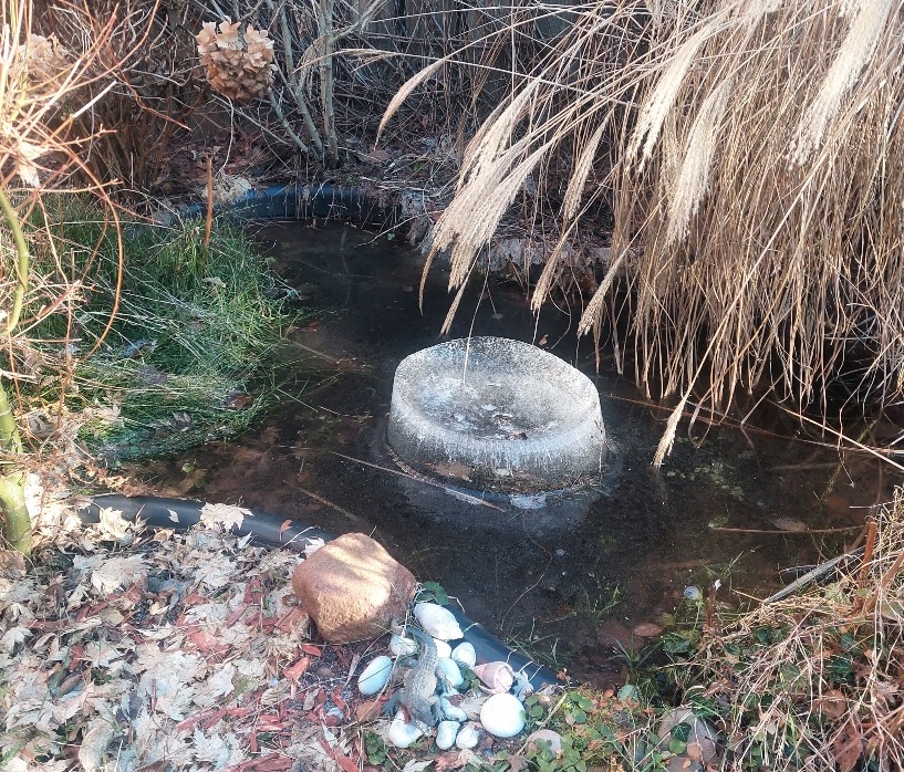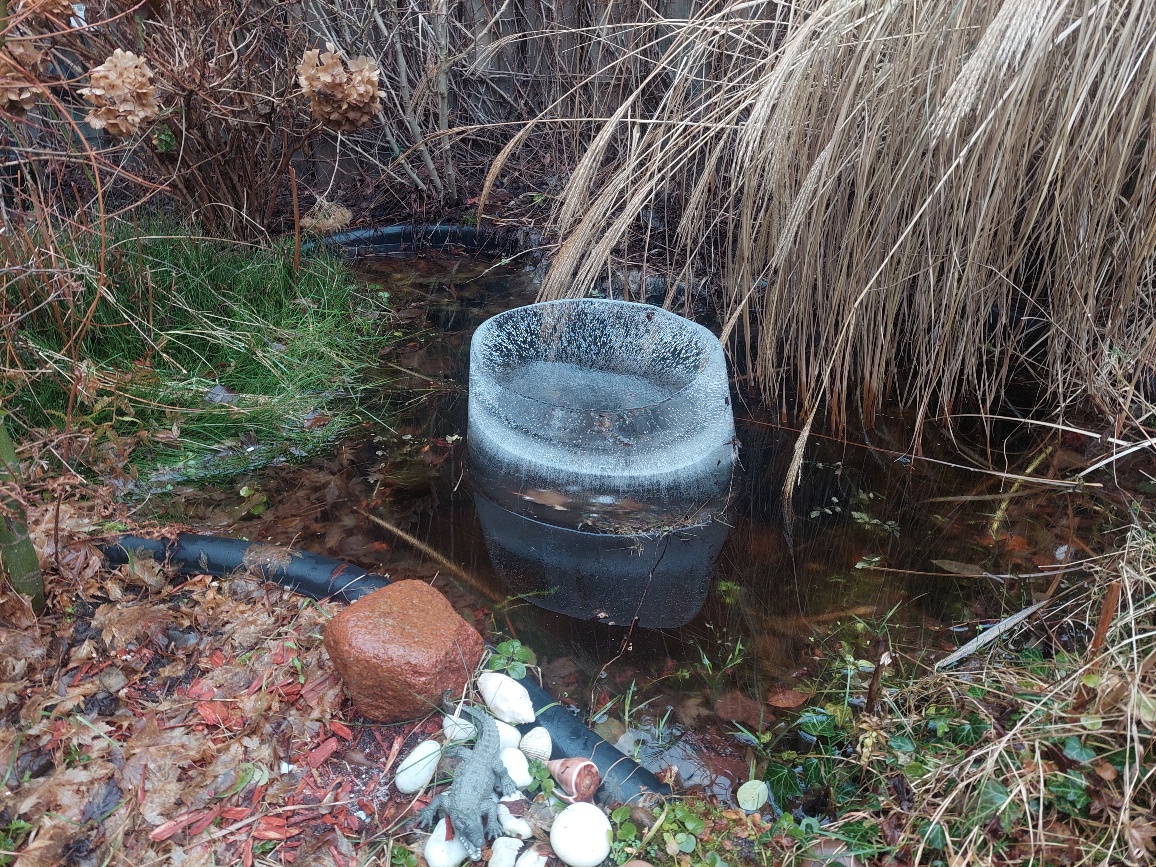 Ich habe in der Kältephase neulich 20 Liter Wasser zu einem Block gefroren und auf der Eisfläche meines Teichs deponiert. Je nach Temperatur sind beide in den letzten Tagen getaut und wieder gefroren, wobei die Unterfläche des Blocks Stück für Stück in die Oberfläche des Teichs einfriert. Ein Akt der Verschmelzung. Bei dem jetzigen Tauwetter mit Regen wird ihre gemeinsame Struktur von allen Seiten angegriffen und es ist absehbar, wann diese Installation verschwunden ist, sich ihre Moleküle ununterscheidbar mit denen des Teichwassers vermischen. Bei meiner morgendlichen Zen-Meditation im Garten inspiriert mich diese Installation zu einem freien Fluten über das Verschwinden und Verschmelzen, über den kosmischen Kreislauf des Vergehens und Entstehens. Im Verschwinden des Eises entsteht Neues, Wasser, der Ursprung von Leben. Der Kosmos ist in Dir, Du musst Dich ihm nur öffnen.