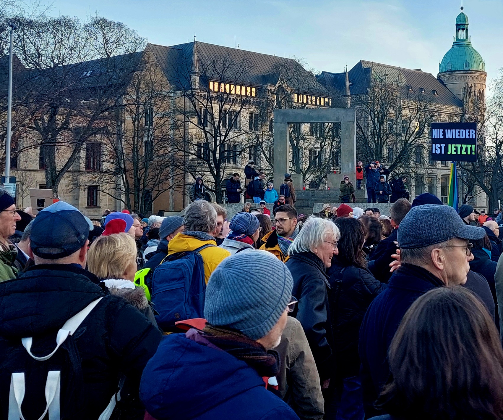 Demo Holocaust-Denkmal in Hannover, 27.01.24, dem Jahrestag der Befreiung des Vernichtungslagers Auschwitz durch die Rote Armee . Es waren mehr Menschen als üblich an einem 27. Januar da, aber bei weitem nicht so viele wie bei anderen Demos gegen Rechts an diesem Tag, in Düsseldorf z. B. waren 100.000. In Hannover gestern deutlich weniger als ein Zehntel jener 35.000, die an der gleichen Stelle vor einer Woche demonstrierten. Bei den Reden wurden doch mitunter allerlei Allgemeinplätzchen gebacken, aber das ist ja nicht selten bei derartigen Veranstaltungen. Die Verdi Jugend immerhin wies auf den Zusammenhang von Kapitalismus, Antisemitismus und Rechtsruck hin.