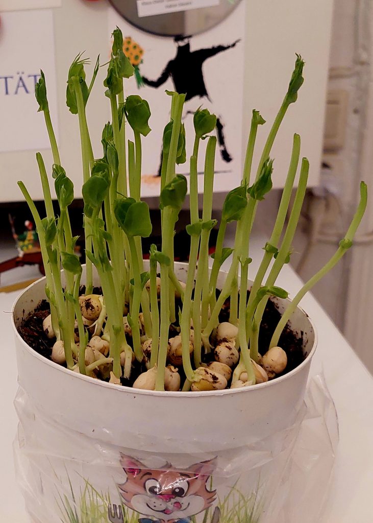 Im Winter sind frische Kräuter Mangelware. Schnelle Abhilfe schaffen eine Handvoll Erbsen (keine Tiko!), 12 Stunden eingeweicht in kaltem Wasser, mit etwas Erde in Blumentopf oder auch einfach durchgefeuchteter Watte oder Toilettenpapier (unbenutzt!) in irgendeinem Gefäß in einem Plastikbeutel verschließen (Treibhauseffekt). Fertig. Nach zwei, drei Tagen keimen die Erbsen, dann können sie raus aus dem Beutel und entwickeln sich in weiteren drei, vier Tagen zum grünen Kraut (Das sind Richtwerte, bisschen probieren). Das Wunder der Photosynthese wandelt Licht in chemische Energie wie Zucker um und dafür braucht die Pflanze nur den blauen und roten Anteil des Lichtes, den grünen nicht, den spiegelt sie zurück. Also sind Pflanzen grün. Zuckersüß und intensiv schmeckt auch das Erbsenkraut. Ich hab’s vor Jahren mal in Delft (Porzellan und Vermeer!) kennengelernt, mittlerweile ist es Standard in der etwas gehobeneren Gastronomie. Als Salatbeilage, auf das Tomatenbrot, in die Suppe, wohin Sie auch wollen. Schnell verbrauchen, das schießt ins Kraut. Lecker, gesund und macht Spaß. Nichts geht über Eigenanbau, es hat auch etwas Kontemplatives, wenn man dabei zugucken kann, wie alles wächst und gedeiht. Bei meinen morgendlichen Zen-Meditationen im Garten verneige ich mich immer still begrüßend vor Bruder Hanf oder Schwester Radieschen. Was halt gerade anliegt. Im Moment ist es in der Küche eben Onkel Erbskraut.