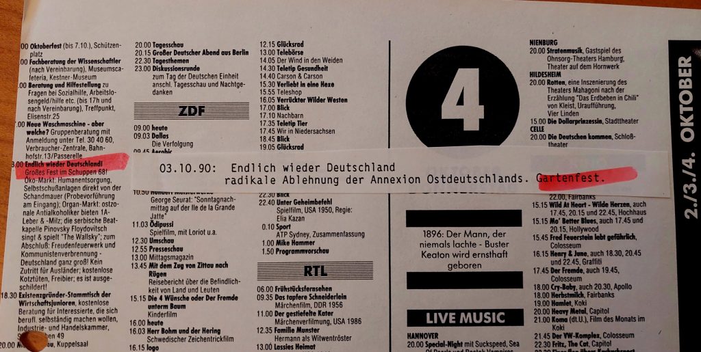 Ich habe diesen ganzen „Das Ende der Geschichte“-Quatsch und „Alles wird Frieden, Freude, Eierkuchen“ von Anfang an für ideologischen Unsinn und zweidimensionale Verblendung gehalten. Hier eine Aktion des famosen Kunstkollektivs SCHUPPEN 68 (Gruß an Peter, unser damaliges Darsteller-Genius und treuer Blog-Leser. Das erste Bier im Hades geht auf meinen Deckel!) vom Reichseinheitstag, dem 3. Oktober, 1990. Im damaligen hannöverschen Stadtmagazin Schädelspalter.