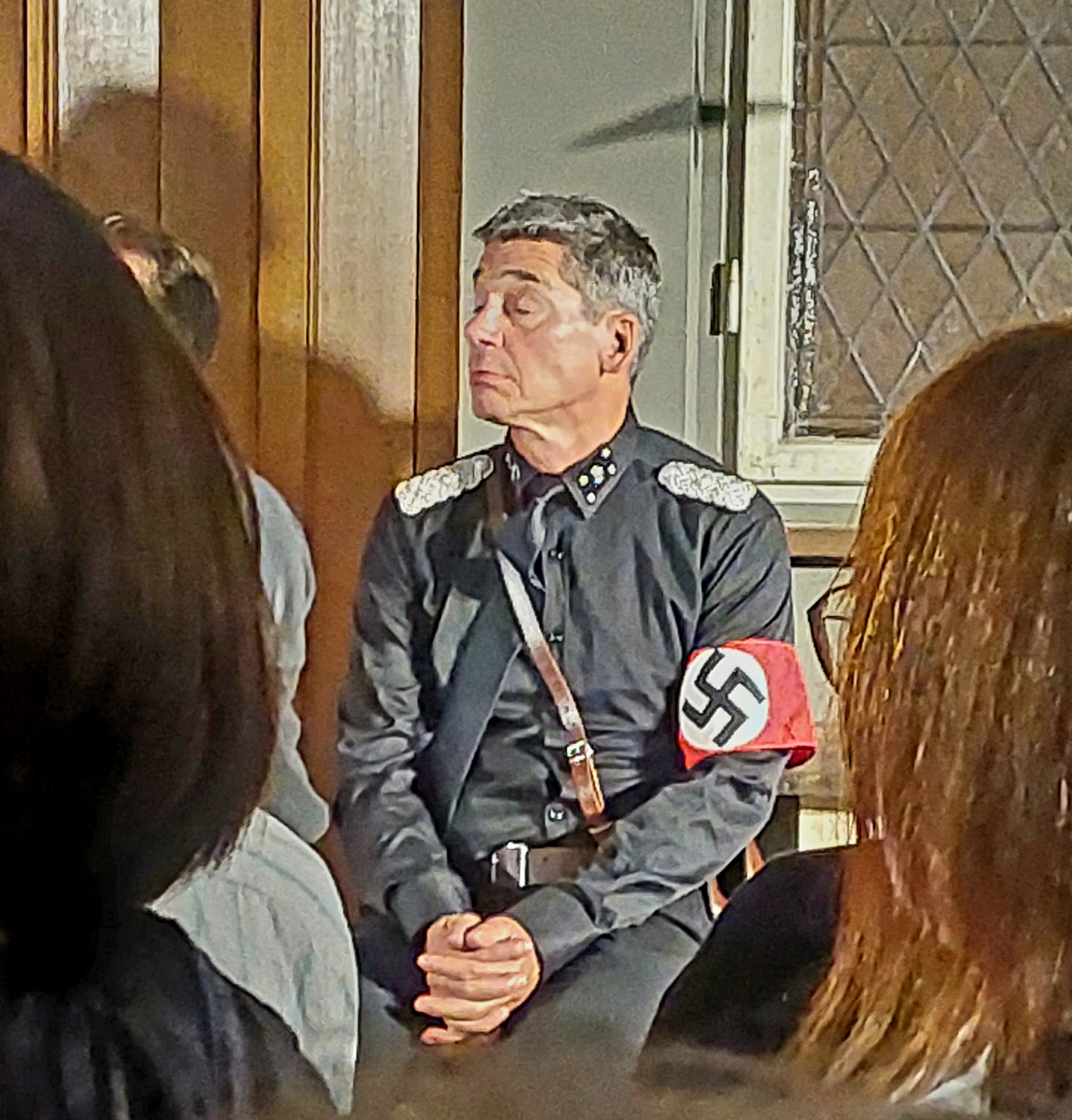 Im Fall des Gestapo Darstellers beruht die Wirkung darauf, dass er in seiner Uniform mit Hakenkreuz durch die unsichtbare Vierte Wand, die die Bühne vom Zuschauer trennt und das Geschehen auf der Bühne zur Künstlichkeit formt, hindurch getreten ist, Teil der Realität wurde. Einer von uns . Mit Hakenkreuz. Das nicht mehr Teil einer Inszenierung war, sondern Teil einer Realität. Auch wenn diese nicht bedrohlich war, fand ich das für einen Moment gruselig.