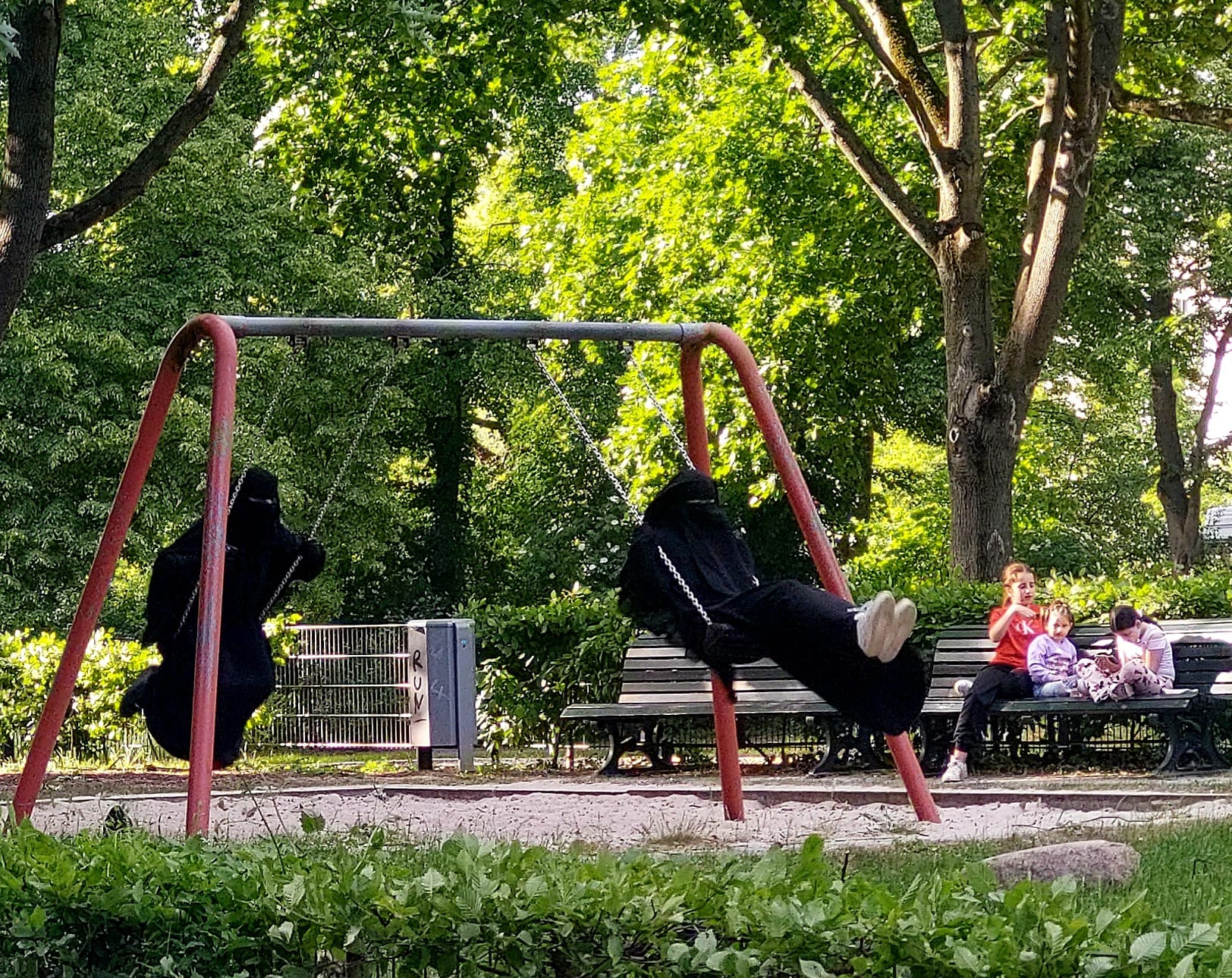 So wie bei den verschleierten Schaukelnden. Der Niqab, dieses Symbol der Entindividualisierung der Frau und von religiöser und gesellschaftlicher Unterdrückung, an einem Ort von Unschuld und Freiheit (zumindest größerer als an den meisten anderen gesellschaftlichen Orten bei uns), das fand ich mehr als gruselig, das empfand ich als bedrückend und bedrohlich.