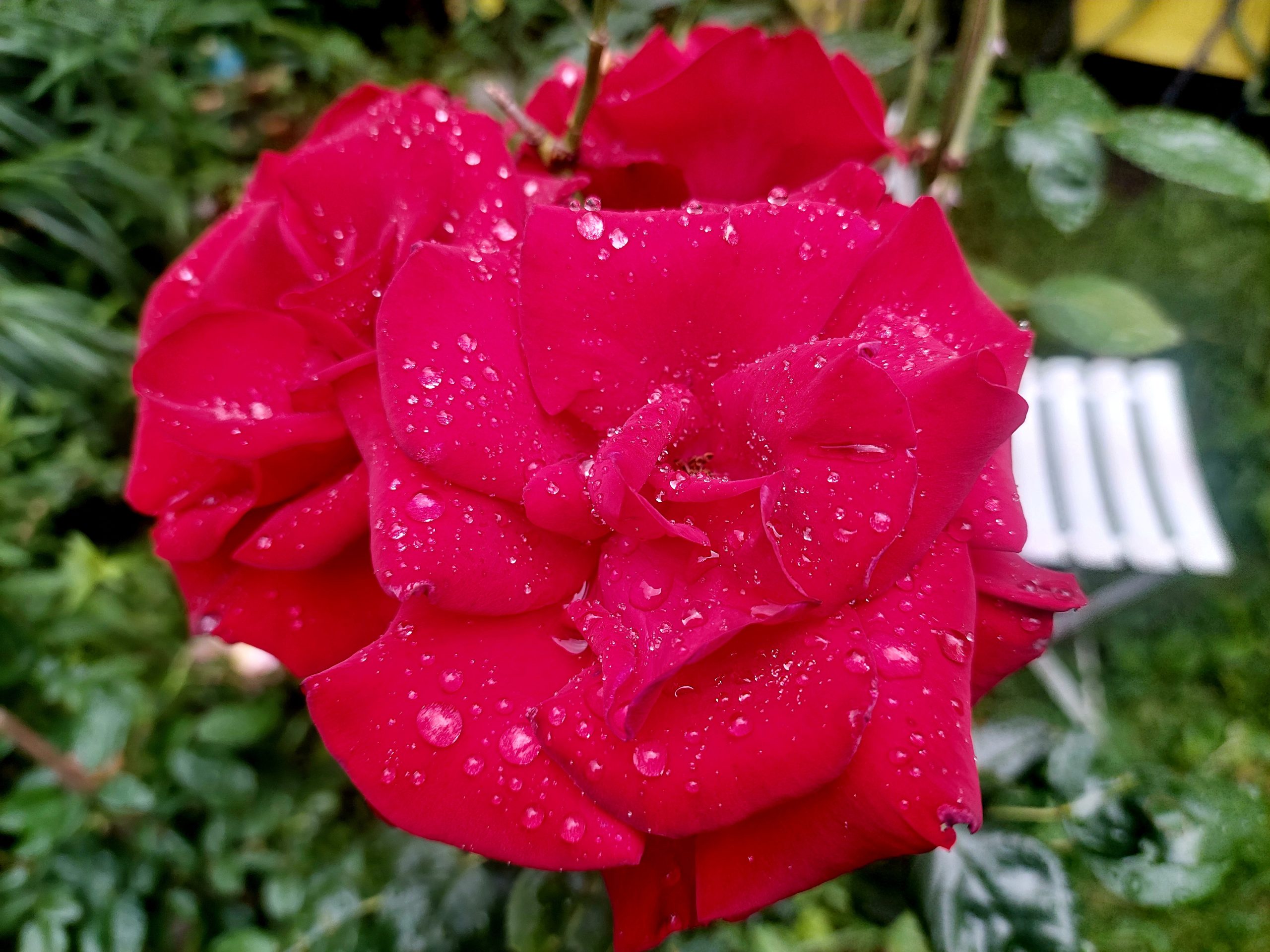 Seit mich bei einem EXPO-Projekt in Hannover eine Duftrose Jayne Austen mit ihrem Geruch im Vorbeiradln förmlich festgenagelt hat, bin ich Rosenfreund. Im Laufe der Jahre haben sich im Garten ca. 20 verschiedene angesammelt, zufällig, unsystematisch, von den meisten kenne ich die Sorte gar nicht, manche mit betörendem Duft, einige von strahlender, üppiger Pracht, wie die oben. Könnte Roter Brokat sein, bin mir nicht sicher. Namen sind Schall und Rauch, was zählt, ist Schönheit als Trösterin in düsteren Zeiten. Das Versinken in den Anblick einer betropften Rose ist eine Meditation.