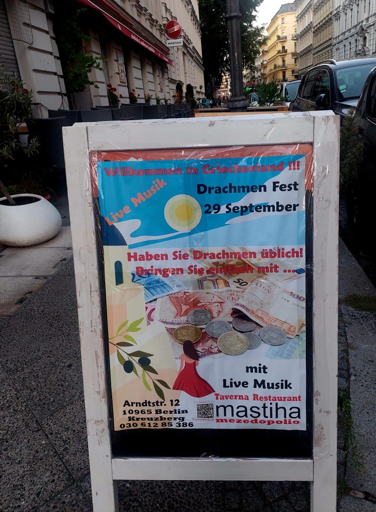 13.08.2024 – Haben Sie Drachmen üblich! Hinterlasse eine Antwort Mein Kreuzberger Lieblingsgrieche. Wenn Sie, liebe Leserinnen, Drachmen üblich haben, kommen Sie einfach vorbei und dann legen wir einen flotten Suflaki auf die Platte. Wahrscheinlich eine Giro-Platte, das ist da so Ouzo. Hasta la faschista.