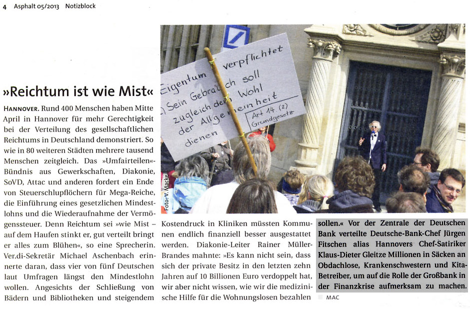 Hannovers Chef-Satiriker verteilt Millionen. Asphalt 05.2013. Das Thema gerechte Steuerpolitik ploppt seit vielen Jahren regelmäßig öffentlich auf, wie das Krokodil im Sommerloch. Seit vielen Jahren nimmt die Spaltung der Gesellschaft zu, die Armen werden immer mehr und ärmer, die Milliardäre immer mehr und reicher, die Mitte der Gesellschaft zerbröselt wie ein Keks in der Sonne und wird immer aggressiver (natürlich nur gegen die da unten), seit vielen Jahren sind SPD und Grüne an der Regierung beteiligt, unterbrochen nur 2009 – 13 von einer CDU/FDP-Koalition, und seit vielen Jahren rührt sich nicht nur Nichts, vielmehr werden die Armen immer mehr ausgeplündert und die Steuern für Unternehmen und Reiche immer commoder.