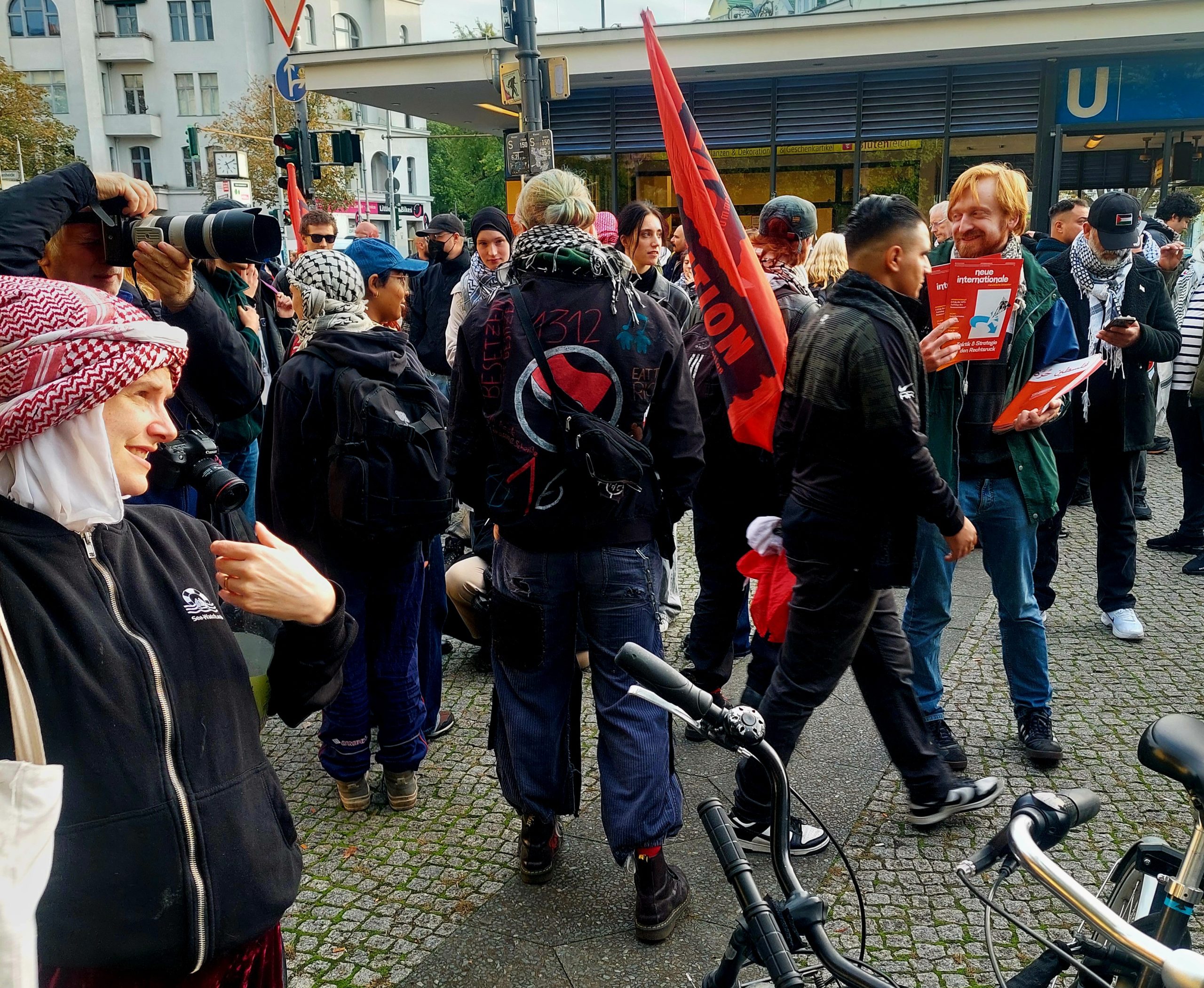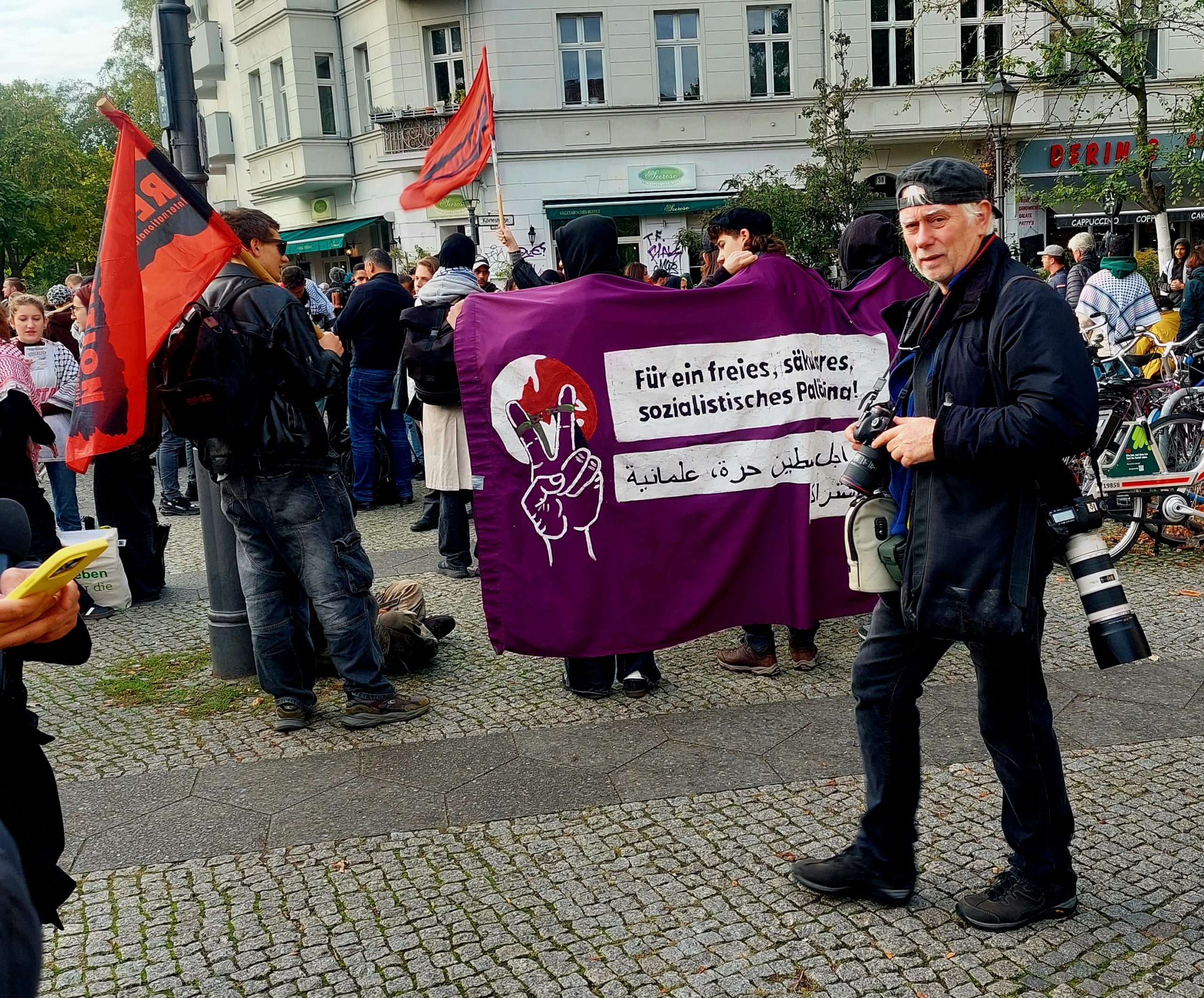 7. Oktober, Antisemitische Palästina Demo Kreuzberg, Am Südstern, ca. 500 Teilnehmende, die Hälfte Linke. Ich dachte im ersten Moment, das sei ein Satiretransparent. Für die Forderung nach einem säkularen Staat würden den offensichtlich von zuviel Gras benebelten Wirrköpfen wahrscheinlich im gesamten islamischen Raum die Hälse abgeschnitten.