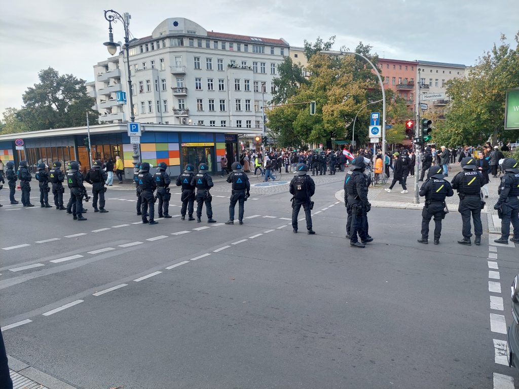 Nach getaner Dokumentationspflicht schloss ich mich der Mahnwache gegenüber an, wo circa 20 Verlorene mit Schildern für Solidarität mit jüdischen Menschen warben. 20 gegen 500, das sind die Maßverhältnisse im antisemitischen Deutschland, 80 Jahre nach dem Holocaust. Ich stand auch nur da, weil eine Kette von Dutzenden Polizisten uns gegen den hysterischen Mob auf der anderen Seite schützte. Dieses geifernde Eingepeitsche mit hasserfüllten Parolen über Megafon ist eine der gruseligsten Impressionen von der Demo. Da gibt es keine Redebeiträge mehr. Nur noch Hass und Hysterie.