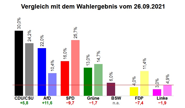 Die Tendenz der letzten Wochen ist klar, alle Parteien mehr oder weniger festgenagelt auf ihren Umfragewerten. Wenn es extrem läuft – und das tut es andauernd – kann die AfD mit einem Stimmenanteil von 25 % einen Mandatsanteil in der Höhe der Sperrminorität von einem Drittel aller Sitze im Bundestag erzielen. Das tritt ein, wenn FDP, Linke und BSW nicht in den Bundestag kommen.