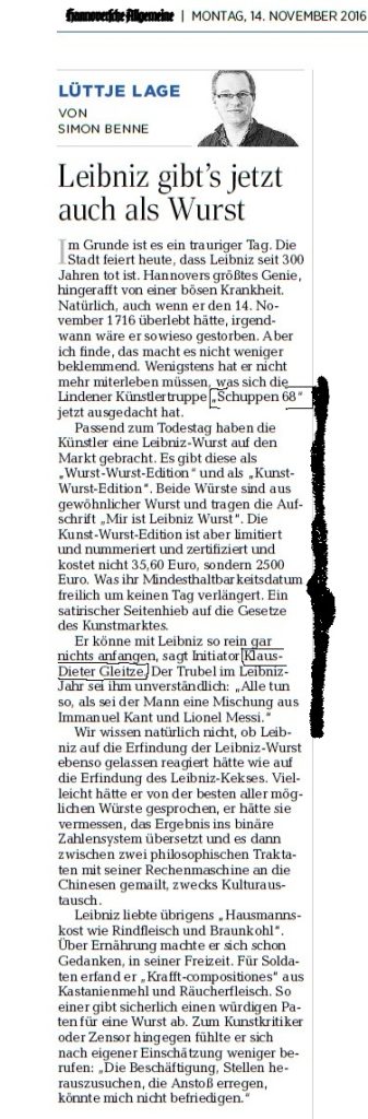Mir ist alles Wurst oder: Leibniz ging mir auf den Keks. HAZ, 14.11.2016.