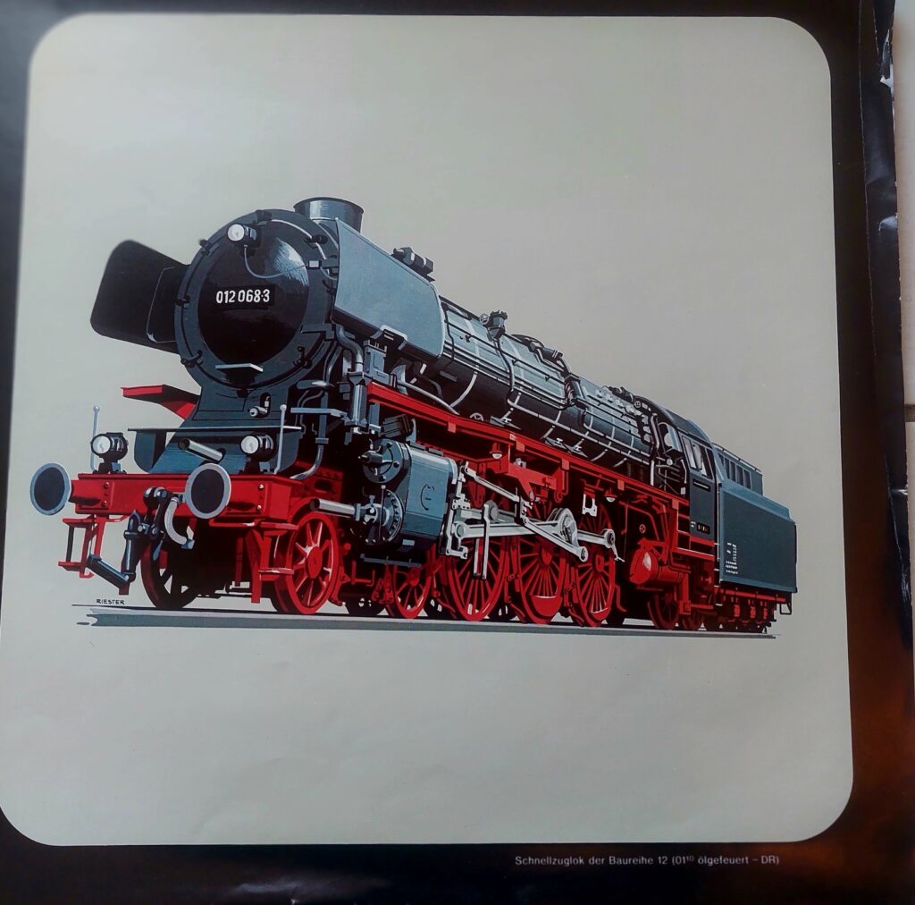 Schnellzuglok der Baureihe 12, ölgefeuert. 1940 in Betrieb genommen. Im Rahmen der Elektrifizierung des DB-Streckennetzes wurde der Betrieb auf den letzten Strecken in den 70ern eingestellt. Die Ölkrise 73 gab dem schnaufenden Ungetüm den Rest.