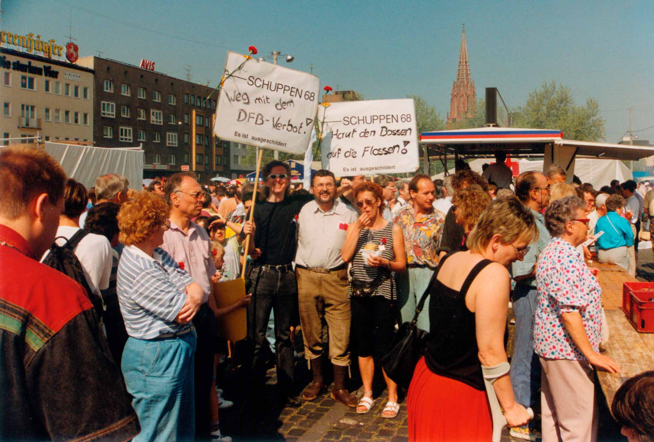 1. Mai Feier, Hannover, Klagesmarkt, 1993. SCHUPPEN 68 Performance. (Zur Erinnerung an Günther „Paul“ Fechner, in der Mitte im hellen Hemd, ehemaliger Betriebsratsvorsitzender der Fa. Hermann Berstorff. Die Guten sterben immer zu früh, egal wie alt sie werden.)