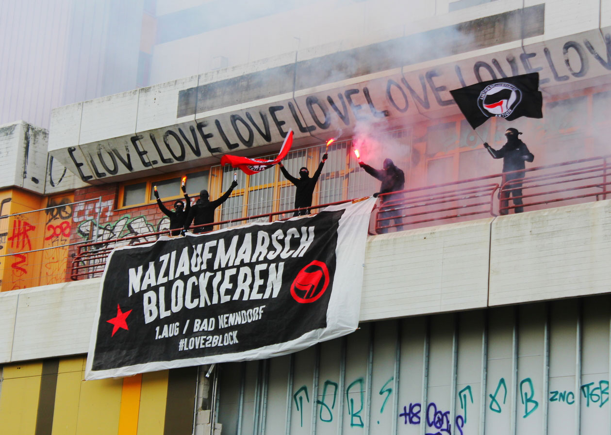 Wacht auf, Verdammte dieser Erde? Haut drauf, Vermummte dieser Erde! Erste Impressionen vom Wegesrand der Maidemo 2015. Autonome hängen Anti Nazi Transpi (Nazidemo am 1. August blockieren) an das hannöversche Ihmezentrum, die größte innerstädtische Bauruine der BRD. Ich empfand bei der Aktion klammheimliche Freude (böses Wort!), weil ich meine Zweifel an deeskalierender Sozialarbeit bei Nazis und an der diesbezügl. Effizienz des staatlichen Repressionsappartes habe, den ich nichtsdestotrotz mit zunehmendem Alter schätze – wenn er an der richtigen Stelle zuhaut. War mal wieder ein schöner 1. Mai. Mehr Impressionen demnächst an dieser Stelle.